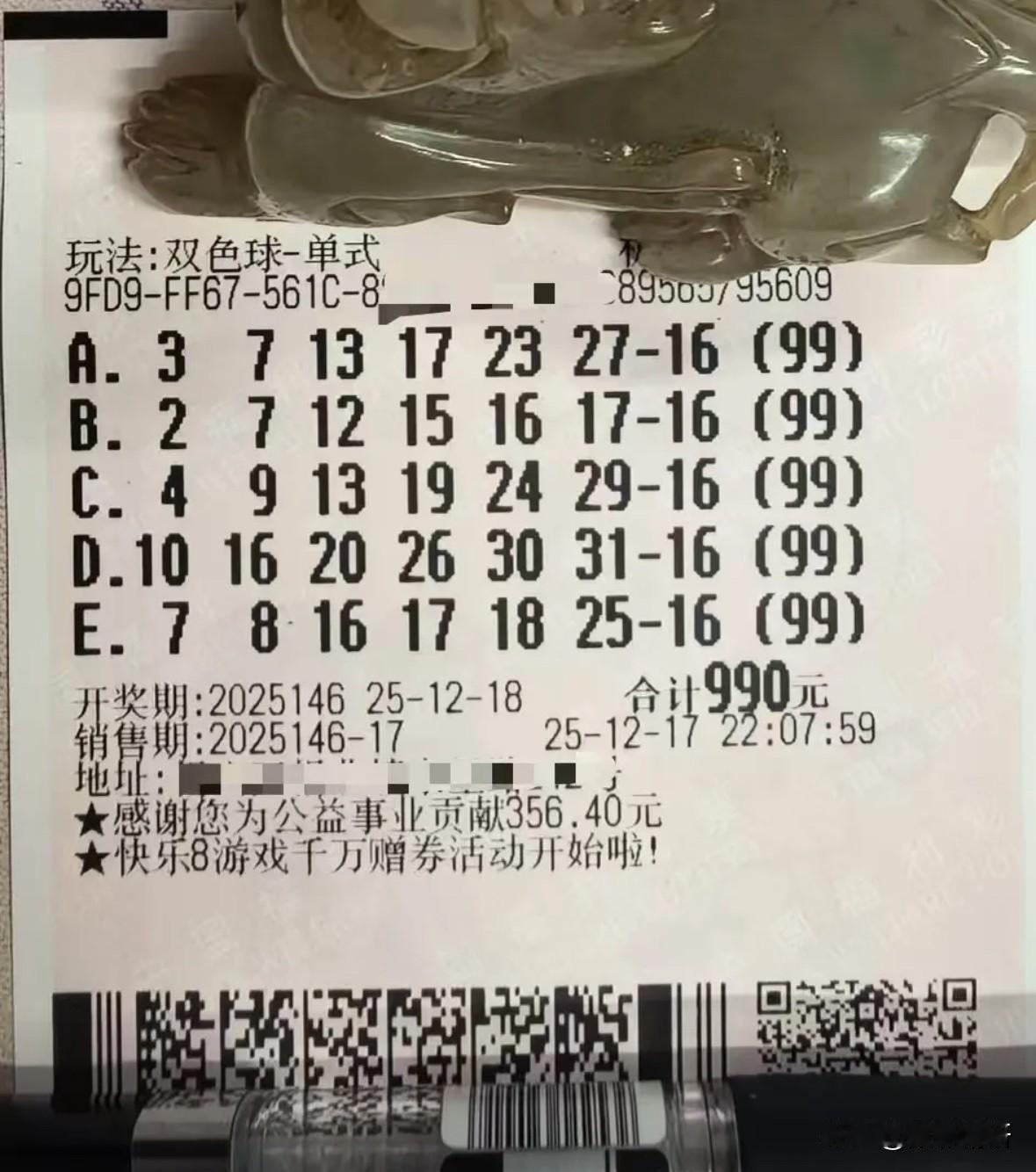 “99倍哥”的双色球25146期实票再次出现,那只熟悉的貔貅也如影随形。每每见到他期期如此大手笔投注,心中不免生出几分疑惑。今日我们不妨替他算一笔账:大乐透与双色球一年合计约300期,每期投入990,一年便是29.7万——这绝非小数目。而今年至今,也未见其传出中得大奖的消息,总体看来,恐怕仍是亏损。 其实,大额投注并不等同于命中大奖,还是希望大家能理性购彩,量力而行。