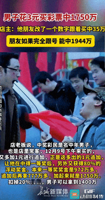 “这就是天上掉馅饼吗?”浙江嘉善,一男子凭借一张3元彩票,竟中了1750万元。与他同行的朋友也沾了好运,在改动一个号码后购买了加倍投注,花费4元中得两注二等奖,奖金35万元! 来源:【长城新媒体】 当天下午,一位中年男子和他的朋友一同走进一家彩票店内! 据悉,这位中年男子是店里的常客,他像往常一样,自己选择了一组号码,并多花1元进行了追加投注,总共花费3元购买了一张单式追加票! 朋友觉得这组号码看起来不错,但临时起意改动了一个号码,并以加倍方式花费4元购买了一注! 次日晚上,体彩大乐透开奖结果显示,这名中年男子购买的彩票中得追加一等奖! 这位幸运儿获得的1750万元奖金中,包含了一等奖基本奖金972万余元,以及追加奖金777万余元! · 关键追加:多花1元的追加投注,使其奖金增加了80%。 · 税后实得:扣除20%个人所得税后,他实际能拿到约1400万元。 · 朋友奖金:同行的朋友因改动一个号码,中得两注二等奖,奖金为35万元。 这位中年男子在开奖后第二天就已前往杭州领奖! 事后,这家彩票店经营者表示,得知自己的店里中出大奖后“心里很激动”! 他透露,这家店之前虽然小奖不断,但从未中出过大奖。此次1750万元的大奖刷新了该店的中奖纪录! 体彩大乐透的一等奖中奖概率约为2142万分之一,不得不说,这位中年男子的运气可谓极其罕见! 他朋友的选择则提供了一个有趣的对比案例:通过改一个号码和加倍投注,朋友用4元成本获得了35万元回报,回报率达8.75万倍! 但如果完全复制朋友的号码,这位朋友将获得1944万多元的奖金。这一数字差异引发了关于“选择与运气”的讨论! 有网友评论道:“有时候一次小小的自主选择,可能就意味着天壤之别的结果”! 面对这样的巨额奖金新闻,相关部门和媒体再次提醒公众,购买彩票应量力而行,理性投注,不可沉迷! 彩票中奖完全是随机事件,不存在所谓的“必中秘诀”或“规律可循”。对于绝大多数购彩者而言,中奖尤其是中大奖的概率极低! 即使像这次事件中的中年男子,虽然是彩票店常客,但其中奖也主要靠的是极小概率的运气! 理性购彩应当将彩票视为一种娱乐方式,而非投资或致富途径!