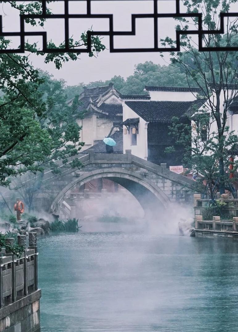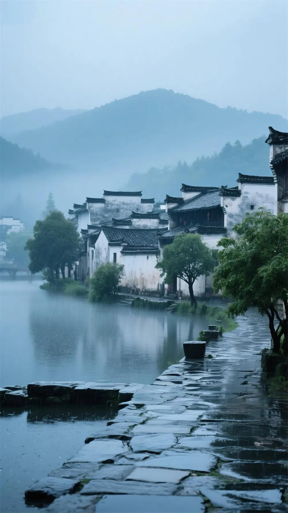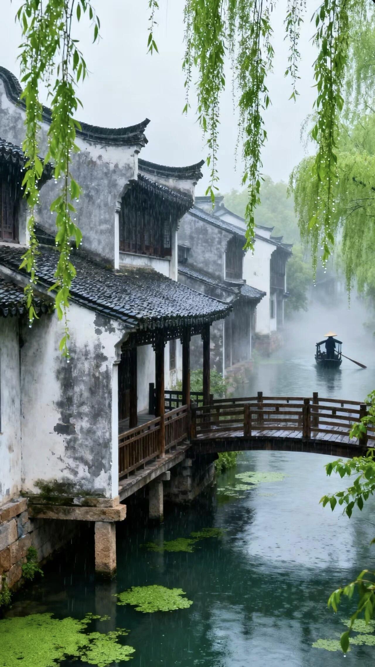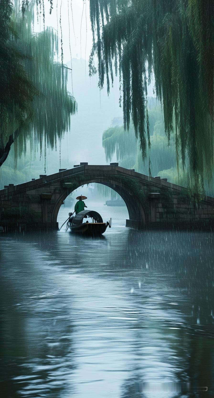 江南的雨,斜斜织在水乡的青石板上。乌篷船从石拱桥下摇出,柳丝垂落沾了雨珠,白墙黑瓦笼着薄雾,船橹声轻,揉碎了一河的温柔。