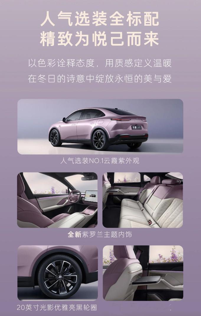 乐道L60紫罗兰限定版上市,限量666台,整车售价21.49万元,BaaS电池租用方案15.79万元,上市即交付,年内购车还能省一笔购置税,至高1.1万元。限量版比标准版贵了8000元,标配人气选装云霞紫外观、20英寸双色轮圈、后排右侧折叠桌板,丁香紫+柔白双拼高级皮革座椅,大理石纹装饰板,这也是乐道首次用错位双拼内饰,情绪价值这方面给到位了。乐道L60