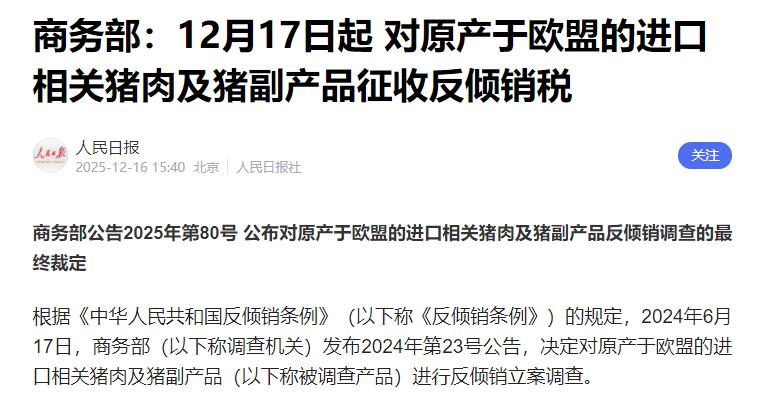 中方出手瞬间,荷兰应声倒地! 12 月 17 日中方正式公布裁定,对欧盟进口的猪肉及猪副产品征收五年反倾销税,税率从 4.9% 到 19.8% 不等。 别看着税率有高有低,可对荷兰来说,这就是实打实的重拳打击。 毕竟它是欧盟里人均猪肉出口量最高的国家,靠对华卖猪肉赚得盆满钵满这么多年,现在好日子算是到头了。 大家可能不知道,中国市场对荷兰猪肉产业有多重要。2024 年的时候,欧盟对华猪肉出口占了它总出口的 47%,价值足足 40 亿欧元。 这里面荷兰占了不小的份额,每年光靠给中国送猪肉,就能赚一大笔钱,不少荷兰养猪户和肉类企业都指着中国市场吃饭。 可现在反倾销税一落地,荷兰猪肉进中国的成本直接往上飙升,以前能靠低价抢市场。 现在这价格优势全没了,跟中国本土猪肉还有其他国家的进口猪肉比,压根没竞争力了。 更关键的是,这次征税荷兰还没占到任何便宜,反观西班牙这些国家,因为之前跟中国沟通到位,还签了专门的农业贸易协议,税率都给得偏低。 平均下来才 9.8%,最低的才 4.9%,可荷兰那些没配合调查的企业,直接被按最高的 19.8% 征税,这一下差距就拉开了。 本来在欧盟内部,荷兰猪肉就靠着出口量大占优势,现在在中国市场被加了重税,西班牙的产品就能趁机抢占它的份额,荷兰想不着急都难。 其实中方这步棋走得又稳又合理,完全是按规矩办事。 之前欧盟的猪肉产业靠着巨额农业补贴,在国际市场上搞不公平竞争,让中国本土的养猪企业压力山大。 这次反倾销调查严格遵循法律程序,就是为了维护公平的贸易环境,保护国内产业的合法权益。 荷兰之前在半导体这些领域,还对中国企业采取强硬措施,现在轮到自己的支柱产业受影响,这只能说是自食其果。 而且中国早就做好了准备,根本不怕进口来源单一的问题。 现在除了欧盟,俄罗斯、巴西、哈萨克斯坦这些国家都在积极跟中国合作,猪肉进口渠道多的是。 少了荷兰这一家,一点不影响国内市场供应。 反观荷兰,猪肉出口是它农业的重要收入来源,中国这么大的市场丢了,短期内想找替代市场根本不可能。 那些已经养起来的猪、建好的生产线,都得面临滞销的风险,相关的养殖户和工人日子肯定不好过。 这也给那些跟中国打交道还想耍小聪明的国家提了个醒,中国市场不是想来就来、想赚就赚的,贸易合作讲究的是公平互利。 要是想着搞不公平竞争,或者跟着别人一起给中国添堵,那中国肯定会果断出手维护自己的利益。 荷兰这次应声倒地,就是最好的例子,别以为自己在某个领域有优势就能拿捏市场,中国有的是办法反击,而且出手就直击要害。 说到底,中方这波操作既合法合规,又精准有力,既保护了国内产业,又让那些不遵守贸易规则的国家付出了代价。 荷兰现在肯定是坐不住了,后续能不能想出办法挽回损失不好说,但至少现在看来,中方一出手,它是真真切切地扛不住了。 这就是中国在国际贸易中的底气和实力,谁要是低估了,迟早得吃亏。