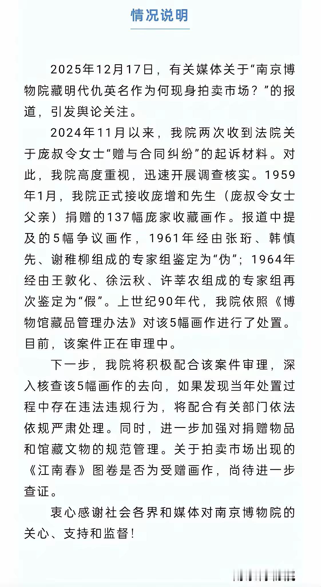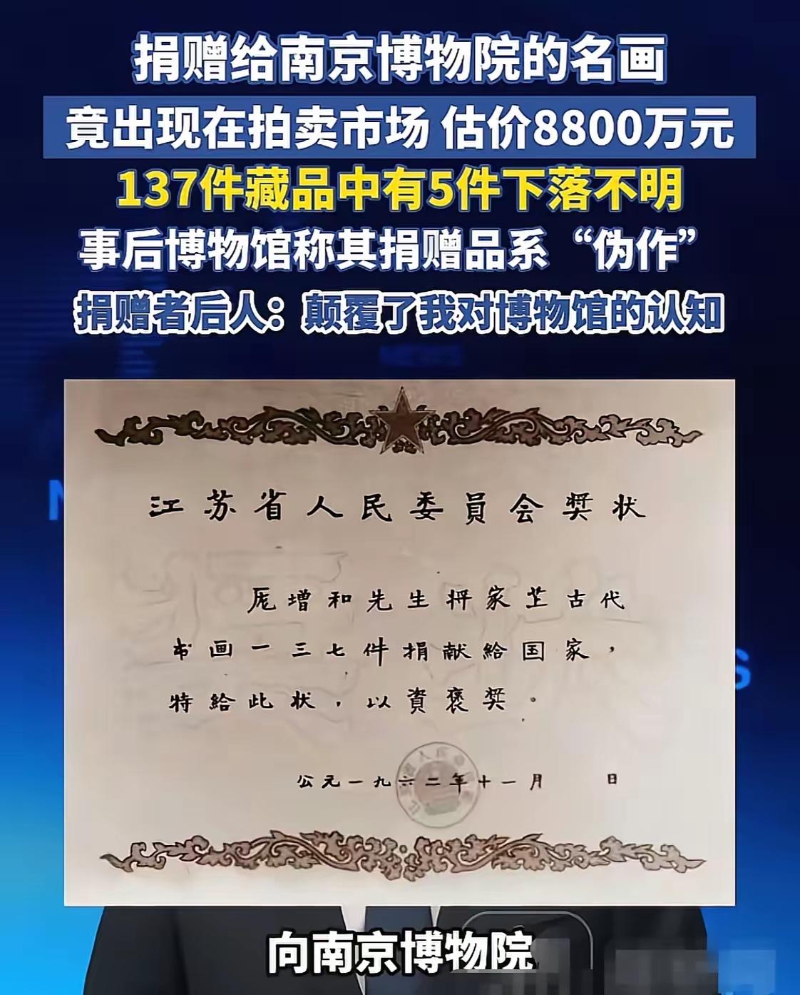 这也太荒唐了吧,荒唐到难以置信,如果这个事情是真的,只能说明参与这个事情的人已经突破做人最基本的底线了! 你敢信吗?堂堂国家级博物馆,竟然能把人家捐进来的国宝级文物搞丢,还拿“伪作剔除”当借口糊弄人,这事儿说出去谁听了不得拍案叫绝,不对,是拍案而起!近日,一则关于南京博物院被捐赠者后人告上法庭的消息,在文物圈和社会各界掀起了轩然大波,事情的来龙去脉,简直比电视剧还离谱。 时间倒回1959年,那是个物质和精神财富都格外珍贵的年代,原告庞叔令的父亲庞增和,怀着对文物保护的一腔热忱,以及对国家文博事业的无限信任,毅然将家中珍藏的137件(套)古画无偿捐赠给了南京博物院。这可不是普通的书画藏品,里面很多都是历经数百年风雨流传下来的宝贝,随便拿出一件,都称得上是价值连城的国宝,每一幅画背后,都藏着一段历史、一个故事,更是老一辈收藏家的心血结晶。庞增和老先生当时的想法很纯粹,就是希望这些宝贝能在博物馆的专业呵护下,被妥善保存、研究,甚至展出,让更多人领略到中华传统文化的魅力。 可谁能料到,时隔半个多世纪,一场意外的发现,彻底撕开了这件尘封往事的诡异面纱。今年五月,庞叔令偶然间留意到北京一场大型拍卖会的宣传信息,不看不知道,一看吓一跳——拍卖名录上,赫然出现了一幅明代绘画大师仇英的《江南春》画卷。这幅画他再熟悉不过了,正是当年父亲捐赠给南京博物院的藏品之一!更让人咋舌的是,这幅画的估价高达8800万元,妥妥的天价藏品。 庞叔令当时就惊出了一身冷汗,自家捐出去的文物,怎么会跑到拍卖场上待价而沽?他不敢耽搁,立刻向相关部门举报,好在经过多方协调,这幅《江南春》最终被紧急撤拍,暂时避免了流落不明之手的风险。但这件事就像一颗投入平静湖面的石子,激起了层层涟漪,也让庞叔令心里埋下了巨大的疑虑:一幅画能莫名流出,那其他的藏品会不会也出了问题? 带着这份不安,庞叔令立刻着手查验当年父亲捐赠的137件古画清单,这不查还好,一查更是让他心凉半截——除了这幅《江南春》,竟然还有另外四件珍贵藏品凭空消失,在南京博物院的馆藏记录里没了踪影。他赶忙找到南京博物院讨要说法,可得到的回应却轻描淡写得离谱:这几件都是伪作,早就被剔除调剂了。至于这些“伪作”的去向,院方却支支吾吾,说不出个所以然来。 这个解释,任谁听了都觉得站不住脚,简直是把别人的智商按在地上摩擦!庞叔令当然不能接受,换做任何一个有良知、讲道理的人,都不会认可这样的说法。要知道,当年捐赠的时候,这些文物可是经过专业鉴定、登记在册的,没人说过它们是伪作;退一万步讲,就算时隔多年重新鉴定,认定这些是赝品,那也该有个正规的流程吧?至少得书面通知捐赠者或者其后人,说明情况,再明确告知这些物品的处置方式和去向,这是最基本的尊重和责任,也是博物馆作为公益机构应有的担当。可南京博物院倒好,一句“伪作剔除”就想把事情糊弄过去,藏品去哪儿了?谁批准剔除的?剔除后是销毁了,还是转卖了?这些关键问题,一个都答不上来。 说实话,看到这个新闻的时候,我真的气得肝疼。文物捐赠,本是一件利国利民的大好事,捐赠者怀着赤诚之心,把传家宝交给国家,图的不是名,不是利,就是一份信任。可南京博物院的这番操作,不仅寒了捐赠者后人的心,更寒了所有愿意为文物保护事业出力的人的心。博物馆是守护文化遗产的殿堂,不是藏污纳垢的地方,每一件文物的入藏、保管、处置,都应该有迹可循、有据可查,容不得半点马虎和猫腻。 如果这件事最终查实,真的是博物馆内部人员监守自盗,或者存在违规操作,那参与其中的人,真的是突破了做人的底线,也亵渎了文博工作者这个职业。文物是不可再生的文化瑰宝,每一件都承载着民族的记忆,容不得任何人肆意践踏。目前这件事还在进一步调查中,我们也期待能早日水落石出,给庞叔令一个交代,给公众一个交代,更给那些默默为文物保护事业奉献的人一个交代。毕竟,信任一旦崩塌,想要重建,可就难了。