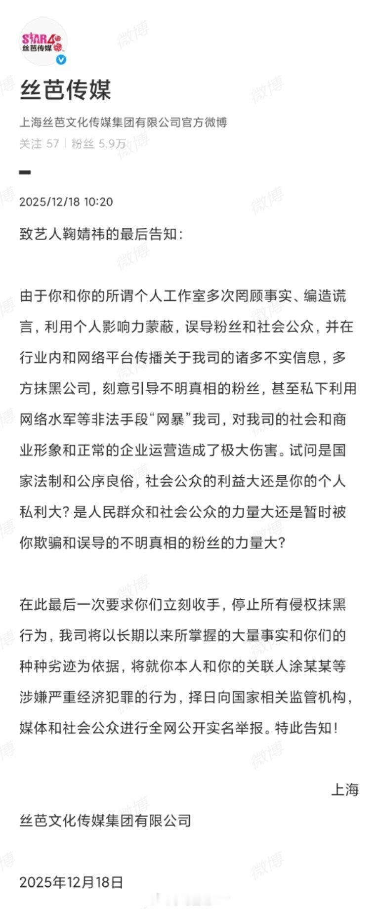 丝芭指控鞠婧祎严重经济犯罪事情闹大了!丝芭传媒指控鞠婧祎涉嫌严重经济犯罪,还要实名举报!这事应该没那么简单,必有蹊跷!丝芭传媒发文致鞠婧祎的最后告知: 由于你和你的所谓个人工作室多次罔顾事实、编造谎言,利用个人影响力蒙蔽,误导粉丝和社会公众。在此最后一次要求你们立刻收手,停止所有侵权抹黑行为,我司将以长期以来所掌握的大量事实和你们的种种劣迹为依据,将就你本人和你的关联人涂某某等涉嫌严重经济犯罪的行为,择日向国家相关监管机构,媒体和社会公众进行全网公开实名举报。丝芭喊话鞠婧祎再不收手将实名举报丝芭致鞠婧祎最后告知