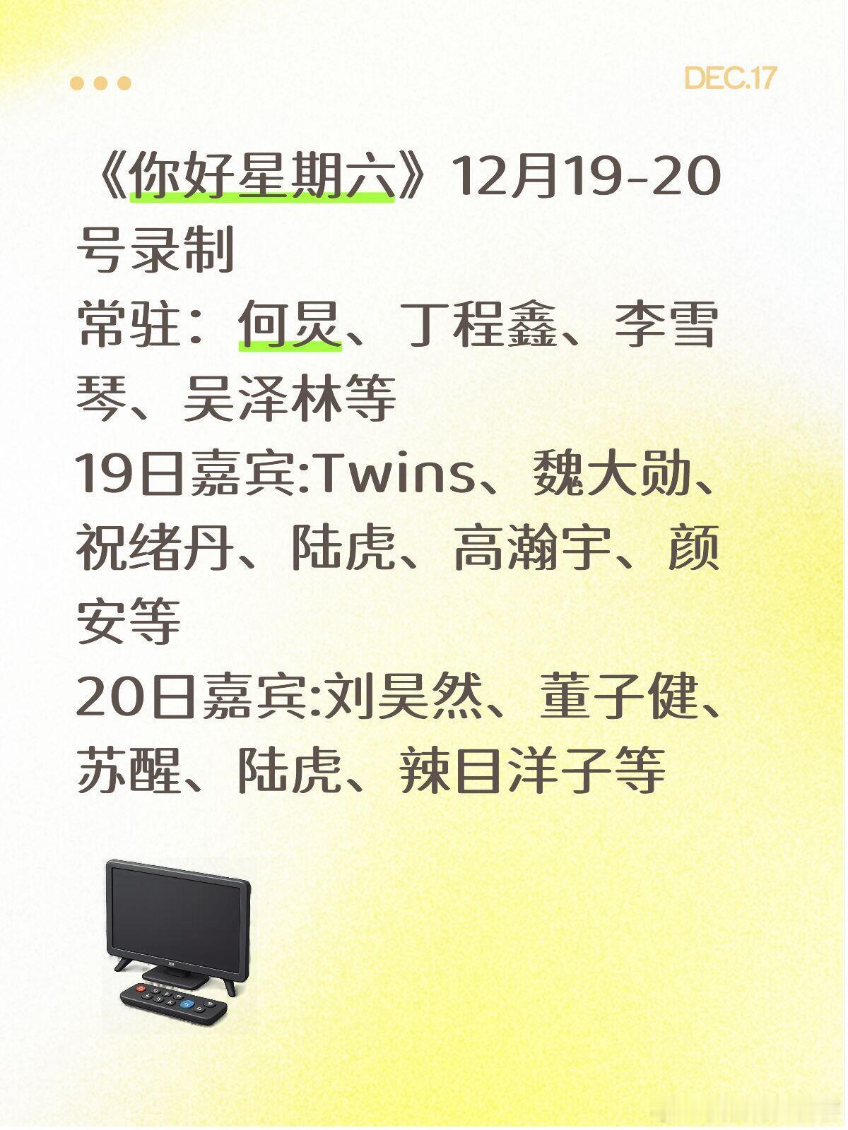 《你好星期六》12月19-20号录制常驻:何炅、丁程鑫、李雪琴、吴泽林等19日嘉宾:Twins、魏大勋、祝绪丹、陆虎、高瀚宇、颜安等20日嘉宾:刘昊然、董子健、苏醒、陆虎、辣目洋子等你好星期六|你好星期六