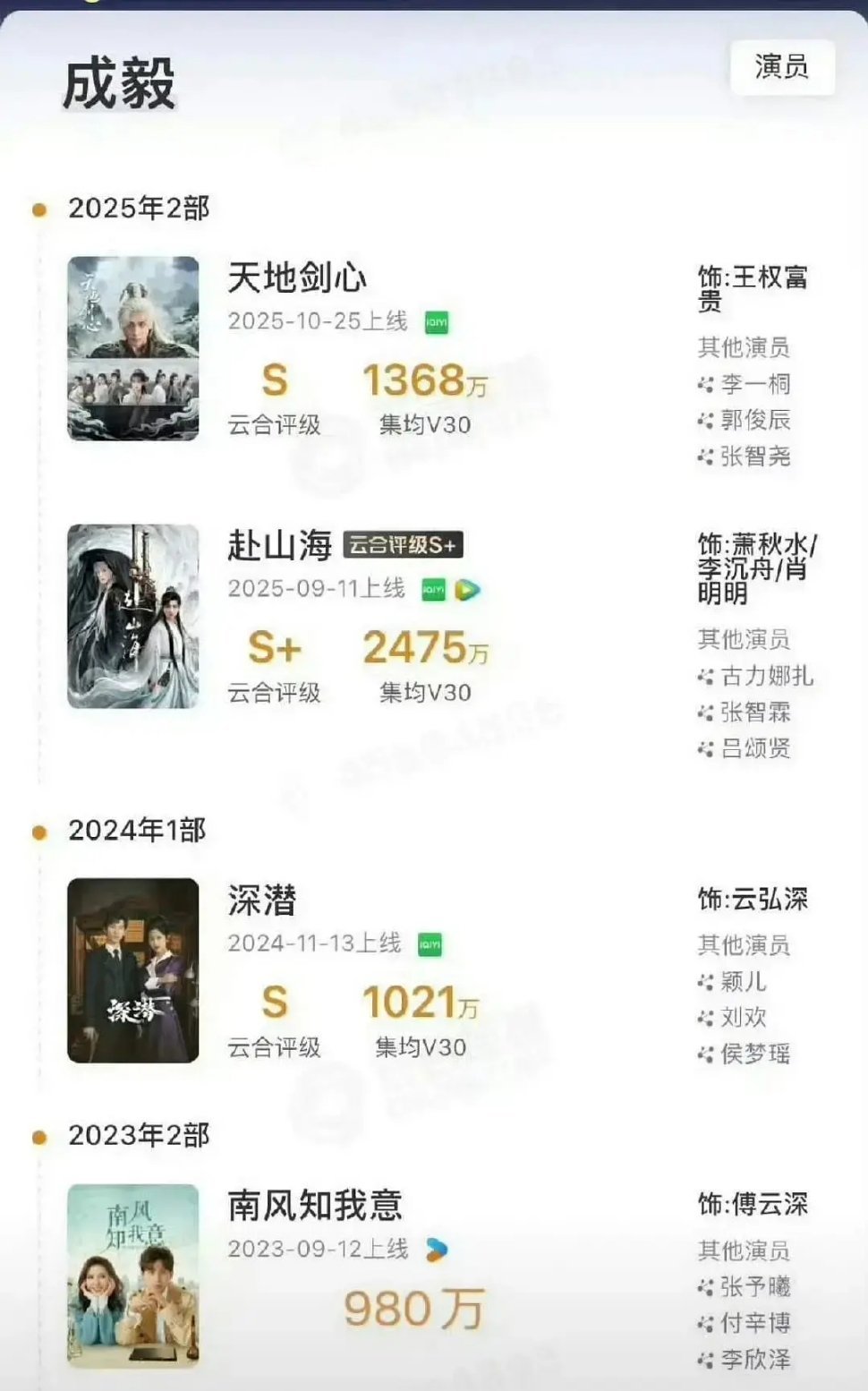 天地剑心热播期结束了,看看成毅连续四部剧的集均,这个成绩怎么样?🤔南风知我意:980万深潜:1021万赴山海:2475万(双平台)天地剑心:1368万这个成绩如何?