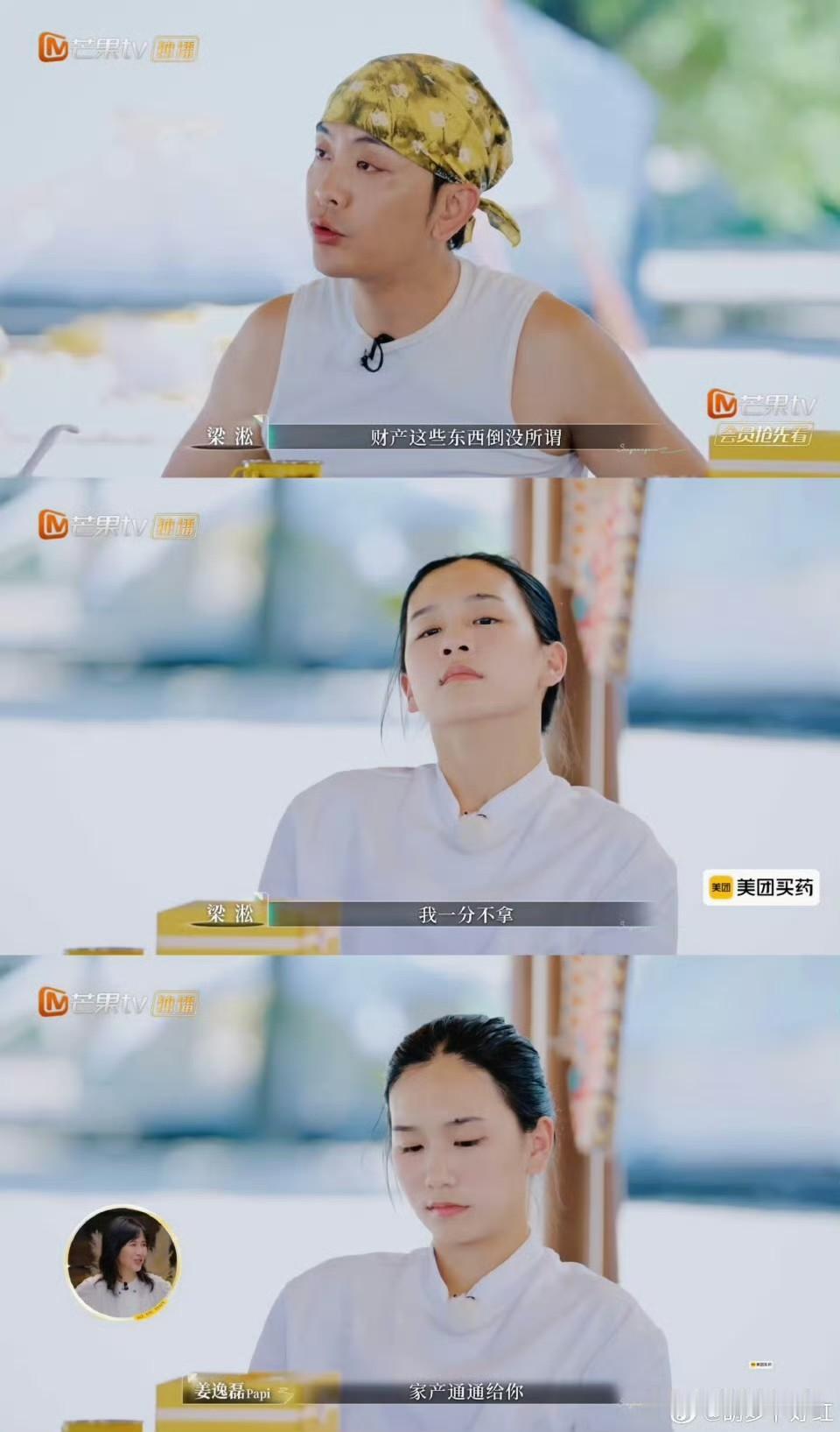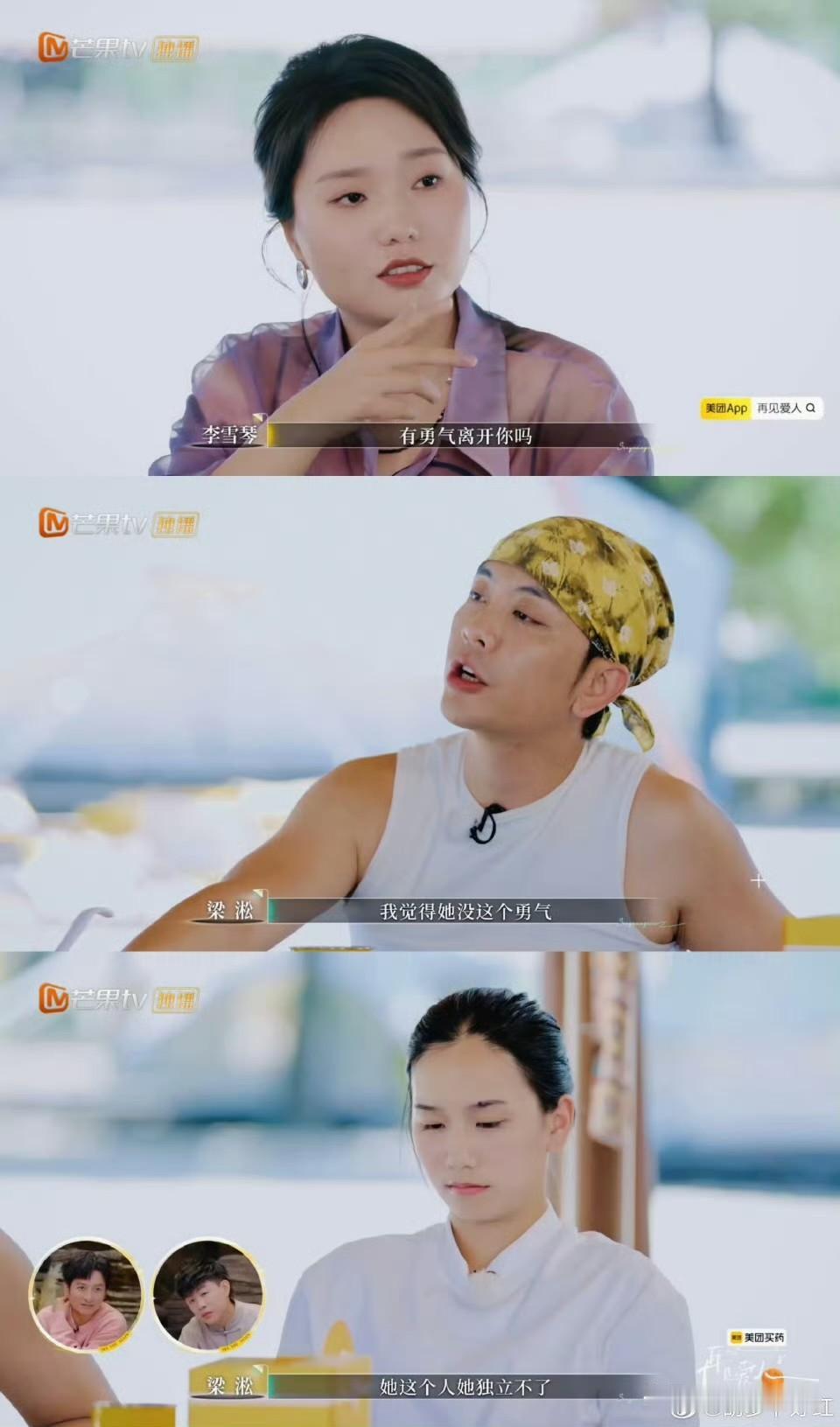 Papi 酱精准吐槽梁淞 李雪琴问梁淞何美延有没有勇气离开他。 梁淞先说 “何美延没勇气离开,没办法独立”一副完全拿捏住女方的样子。 接着却说:“真分开我所有的都给你,一分不拿”。 这个发言是真的很装,明明很自私,却还装大气,漂亮话谁不会说? Papi一眼看穿,直接补刀“家产都给你但头巾不给你”。 还是那句老话:不要看他说了什么,多看他做了什么。 梁淞何美延