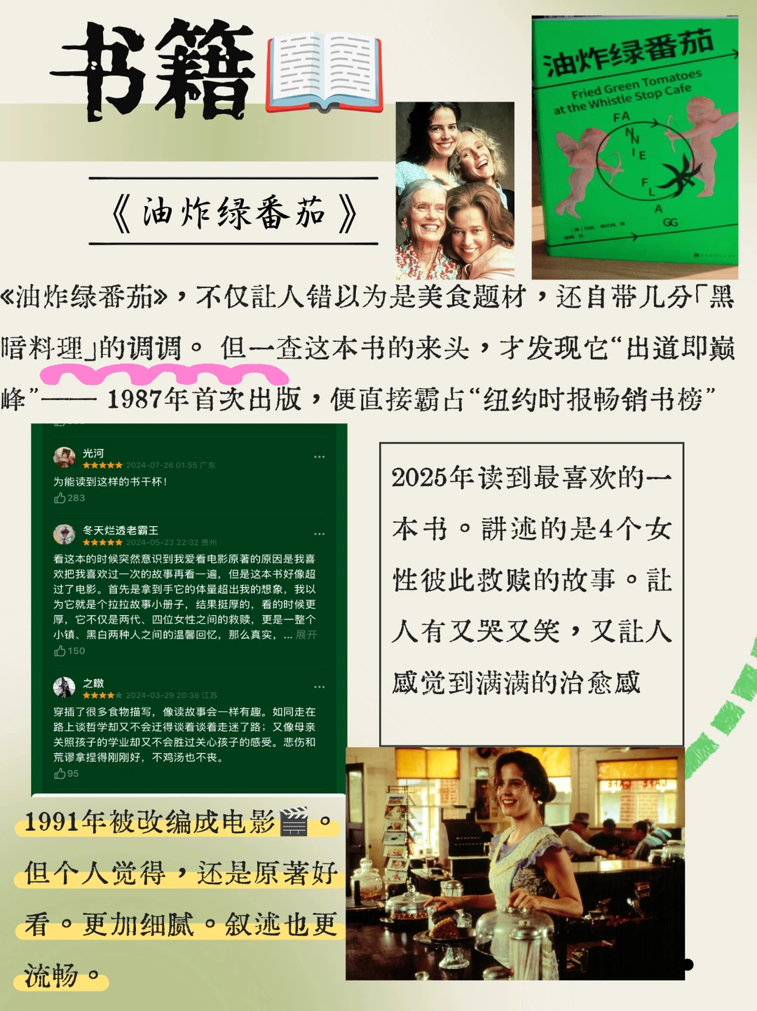 迟到的复盘~ 11月,去了一趟上海参加了上海国际童书展。 开始认真的写日记了。一般从3个维度展开~ 1⃣这一天,我内心的烟花时刻,也就是让我开心的事,可以是大事,也可以是生活的细微小事。 2⃣我受启发的一点,这里要写你的思考,你对某一件事的思考。或者是你看书,看新闻,看节目的思考。 3⃣回顾今天,有没有什么让你遗憾的地方。 很好用,也建议大家试试 . 🔶阅读: 《油炸绿番茄》 1987年出版的书,但是现在看一点不过时。是我今年最爱的一本书,讲述了4个女性在不同时空互相救赎的故事。书中艾姬和露丝开了一家咖啡馆,油炸绿番茄是其中的一道招牌菜。 . 《从一到无穷大》 非常非常经典的一本书。是世界科普文学的经典之作。借这本书重新拾起对世界的好奇心!很多人读不懂就放弃,是因为失去了对数字,空间,时间的好奇心。❤ . 《一生自渡》 宗璞是“课本里的作家”,也是被低估的一位女性作家。她的长篇小说、短篇小说、散文、童话都写的非常好。她出生于书香世家,是哲学大师冯友兰的女儿。她从小体弱多病,又经历动荡,但她把苦难化解成自己笔下的文字。读她的作品很舒服,能够在其中品悟到哲思。 . 《见树又见林》 豆瓣8.7,很棒的一本社会学书籍。可以和《工作、消费主义新穷人》放在一起看,能够让你更加清楚看到社会环境,以及可以解释我们的种种行为,让我们更好的自处。 . 🔴儿童文学 这个月看了2本儿童文学, 《我的我的》赵卯卯 《迷雾幻想湖》张友渔 通过这两部作品,认识了2位宝藏的作家。赵卯卯老师她的笔触很细腻,让人感觉到她的心里真的住了一个孩子,另一个作家张友渔是台湾的,她的这本书其实很小众,但是很精彩,讲述了一个卡嘟里部落的故事,一环扣一环。她会带着书里的角色一起生活,让故事慢慢长出来~ . 🔷写作 5篇文章 三篇童话(修改一篇),一篇书评 . 🔴电影 《捕风追影》前半部分还可以,节奏紧凑,后面感觉很一般。 《浪狼山小妖怪》还挺喜欢的,有很多场景很打动人,尤其是最后,他们合体对抗黄眉怪,最后变回原型。 . 💕访谈 《鲁豫漫谈》对谈易立竞 《鲁豫漫谈》对谈戴锦华 这两期都很值得看呀! . 🔶播客 《岩中花述》S8E3 鲁豫对话扎十一惹 .《岩中花述》S8E2 鲁豫对话陈慧 .《罗永浩的十字路口》罗永浩对话宋方金(这一期有5个小时,但信息量很大,值得听,有很多小故事) 👧我是纯粹,自由撰稿人,儿童文学爱好者。 梦想出版属于自己的散文集和童话故事集