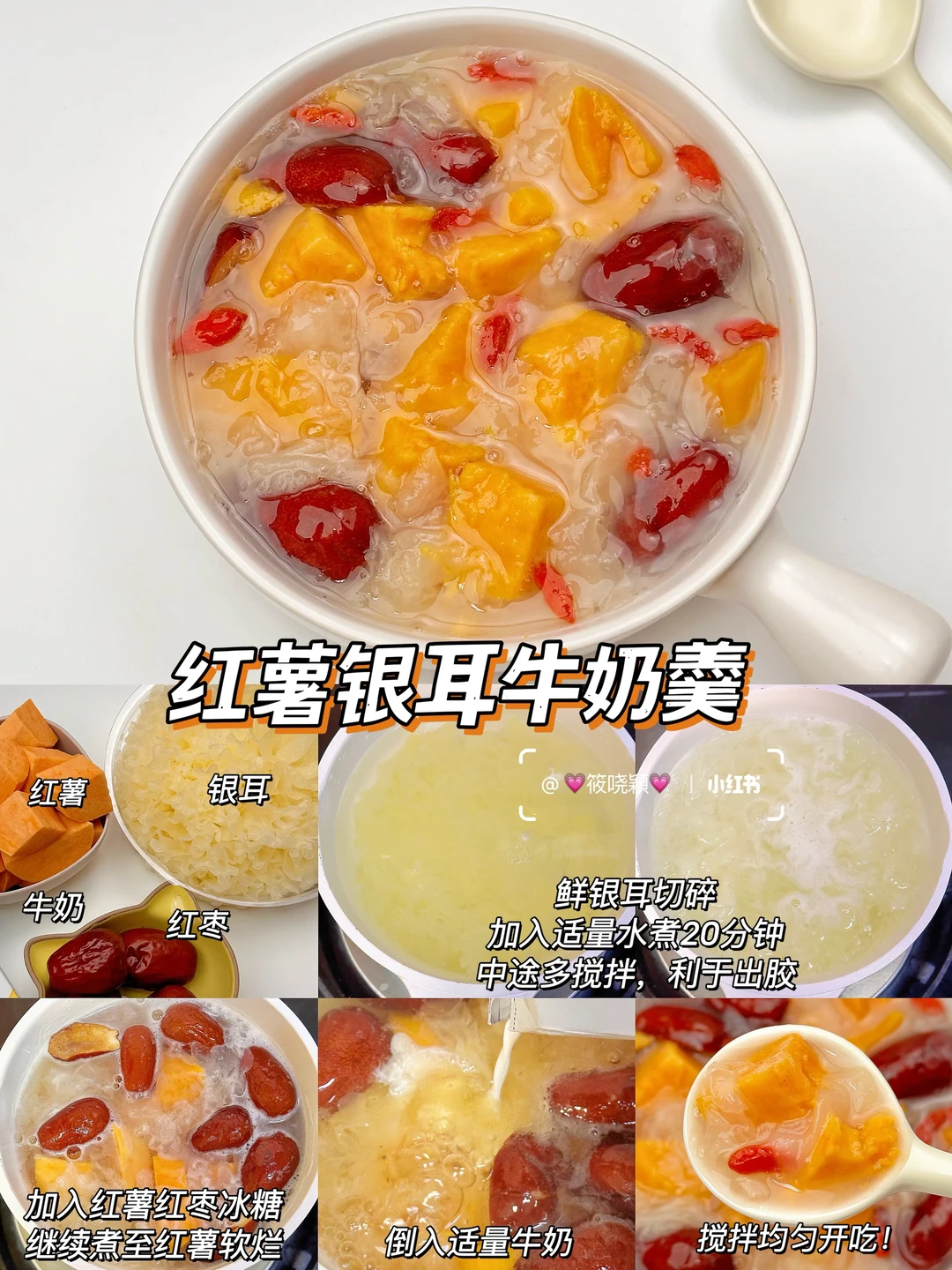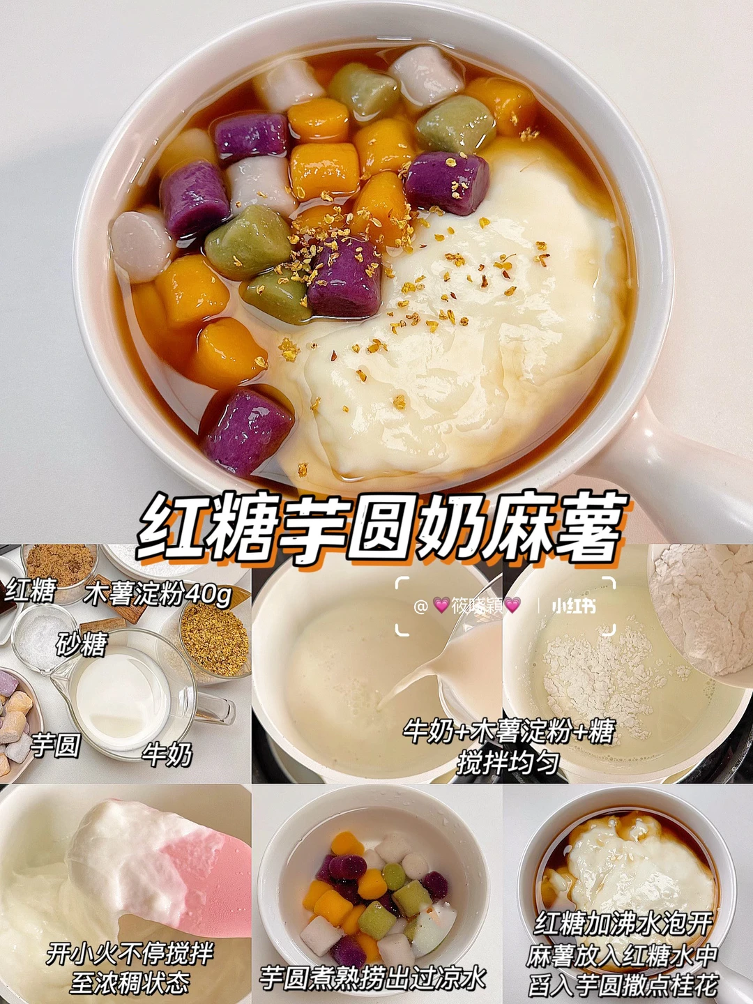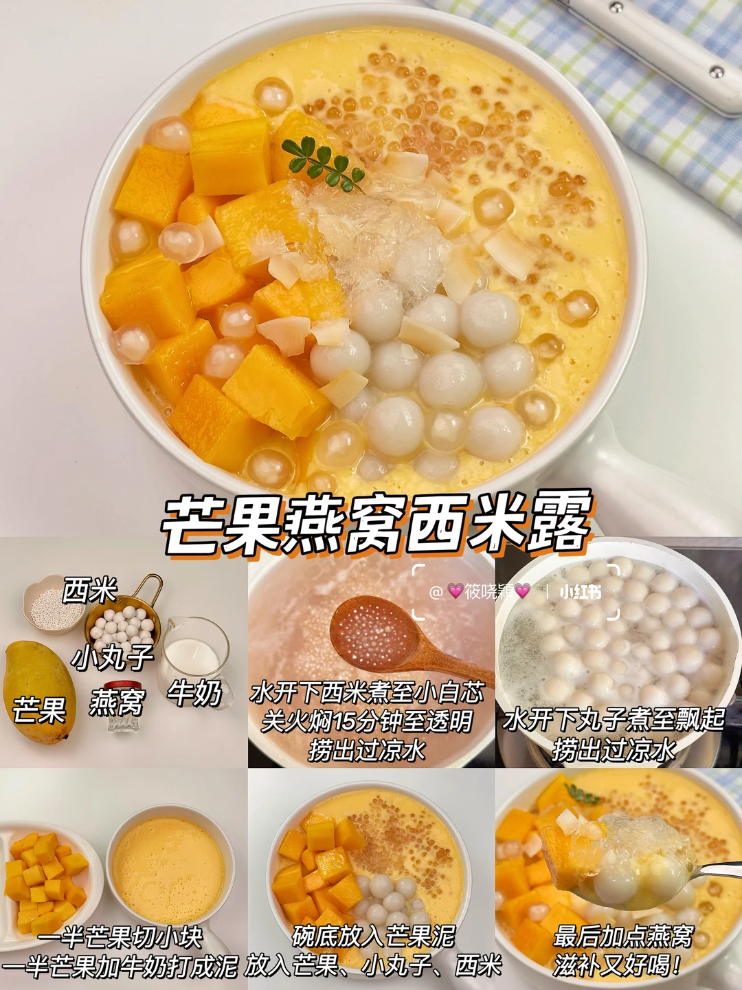 9款秋冬季适配的养生小甜汤来咯~ 天冷了手脚冰凉又馋甜品的姐妹不妨在家试试,营养滋补,软糯香甜,亲测每款都好喝! - ✅芒果燕窝西米露 ✅草莓啵啵牛乳 ✅香芋紫薯西米露 ✅红豆桂花小丸子 ✅红薯银耳牛奶羹 ✅芋圆水果捞 ✅牛奶银耳羹 ✅红糖芋圆奶麻薯 ✅红枣阿胶炖蛋 - 🌈具体食材和做法都在图片里啦!有问题欢迎举手🙋🏻♀️提问,期待你们交作业😘