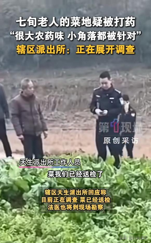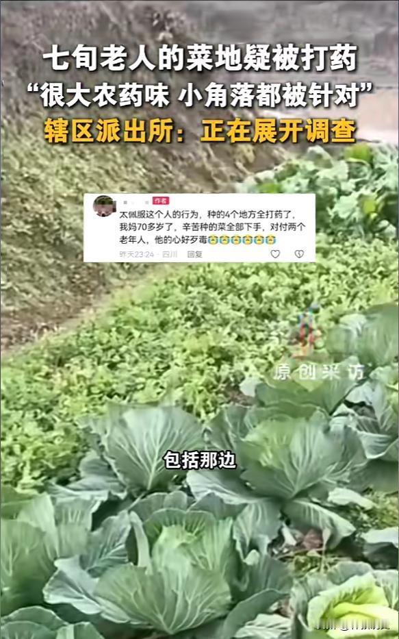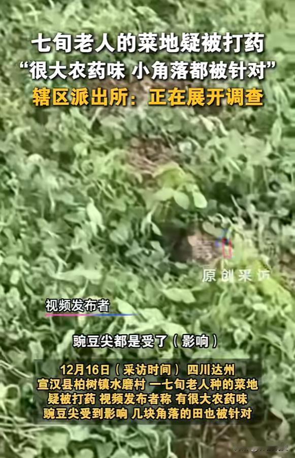 “严查到底!”,12月16日报道,四川达州一老人去菜园干活时,突然闻到一股浓烈的农药味,意识到不对劲,于是仔细观察,发现地里面的蔬菜都被喷了农药,小角落都没放过,很多菜都已经蔫了,显然是有人故意为之。[思考] 七十多岁老人打理的菜园,一夜之间被人恶意喷洒农药,蔬菜大面积枯萎,长势最好的豌豆尖受损尤为严重,目前警方已介入调查,蔬菜样本也已送检,等待进一步结果。 在江苏启东,曾有人因邻里矛盾向邻居菜地喷洒草甘膦,导致一家四口食用后中毒,绍兴也有老人发现自家菜叶出现异常白色水渍,怀疑被人打了药水。 恶意喷药行为,直接导致经济损失,更隐藏着健康风险,若在农药残留期内采摘食用被污染的蔬菜,很可能引起中毒。 像百草枯这类剧毒农药,目前尚无特效解药;而草甘膦等常见除草剂,长期或大量接触也可能危害健康。 如果怀疑自家菜地被恶意喷药,最稳妥的做法是暂时不要采摘食用,待事情明朗。 日常进行农药喷洒等农活时,务必做好防护佩戴口罩、手套,并注意适时休息,避免长时间作业吸入药物。 守护菜园,不仅是守护劳动成果,也是一份生活安宁的期盼,期待事件早日查清,让老人能重新安心耕种。 一夜之间被人恶意喷洒了农药,绿油油的蔬菜都蔫了,尤其是老人最喜欢的豌豆尖受损最重,这事儿搁谁身上不寒心呢? 网友评论摘录 “这心也太狠了!跟老人有多大仇啊?” “自家种的菜图的就是个放心,这下倒好,连这点安全感都没了。” “必须查清楚严惩!12天拘留太轻了。” “太轻了”,呼吁一定要依法严肃处理本次事件的肇事者,以儆效尤。 “远亲不如近邻,这话现在听着真讽刺。” 有点摩擦本可以说开,采用这种极端方式害人害己,实在太不应该了。 “农药残留不是小事,希望老人一家身体没事。” 即便是中等毒性的农药,如果清洗不净就食用,也可能导致中毒,对老人和孩子的潜在危害更大,希望有关部门也能关注后续的健康影响。 您觉得对于这种恶意损坏他人财物(特别是农作物)并可能危害公共安全的行为,除了法律处罚,还有什么更有效的方式来预防和化解这类邻里矛盾吗? 欢迎在评论区分享您的看法和建议! 信息来源:第一现场