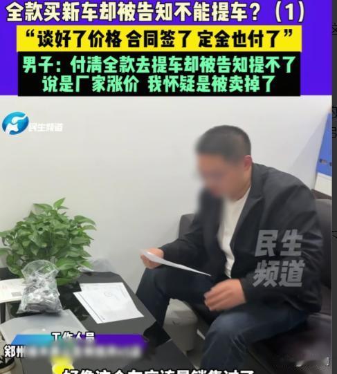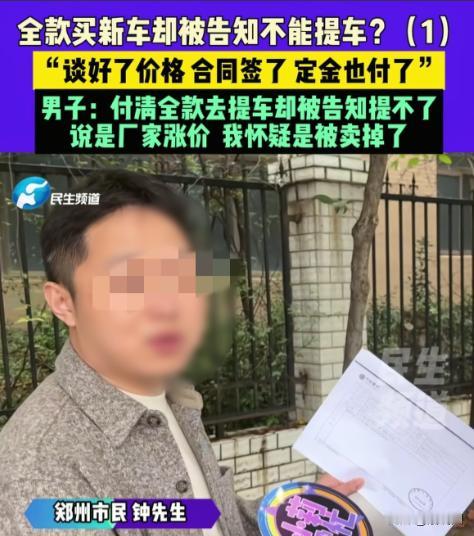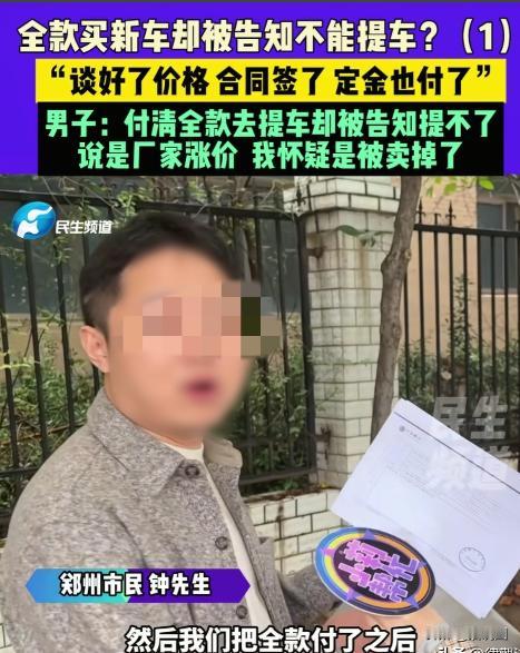 河南郑州,男子去买车,跟4s店谈好,车款109800元,全款支付,双方签了合同。可男子全额付款后,对方却告诉他:厂家涨价,车没了,如果实在要,就得加钱。男子傻眼:双方是白纸黑字签了合同的,怎么能涨价就涨价呢?他怀疑车被卖掉了,找到4s店,工作人员却说:流程存在疏忽,不是一个人卖这台车,很多人销售,车子已经被销售了。 “就没见过这样干的!”面对镜头,河南郑州的钟先生情绪激动又无奈。原本一次再普通不过的买车经历,却在全款付款、合同签订后突然“变了卦”,让他至今无法理解。 近日,钟先生向媒体求助,讲述了自己在郑州某汽车4S店购车时遭遇的离奇一幕:合同白纸黑字写得清清楚楚,车架号都有,结果钱付完了,对方却说车没了,要么加钱。 事情曝光后迅速在网络上引发热议,不少网友直呼:“这不是明摆着违约吗?” 钟先生介绍,今年早些时候,他到郑州一家汽车4S店看车。经过多次沟通,双方最终谈妥了一辆裸车价为109800元的汽车,采用全款支付方式。 “价格谈好了,配置也确认了,销售人员说车源没问题。”钟先生表示,双方随后正式签订了购车合同,更让他放心的是,合同上不仅明确了车型、价格,还清楚写明了具体车架号。 在很多消费者看来,写明车架号,意味着车辆已经被锁定,交易进入实质履行阶段。 随后,钟先生按照合同约定,一次性支付了全部车款。钱到账后,他本以为只需等待提车通知,没想到几天后,却等来了一通让他难以接受的电话。 4S店工作人员告诉他:“厂家涨价了,这台车现在没有了,如果还想要车,需要再加钱。” “我当时整个人都懵了。”钟先生回忆道,“合同已经签了,钱也全额付了,这又不是订金,是全款。怎么能说涨价就涨价?” 钟先生怀疑,这并非所谓的“厂家涨价”,而是车辆被转卖给了其他客户,于是他再次来到4S店,要求对方给出合理解释。 面对质疑,4S店工作人员的说法却让事情变得更加扑朔迷离。 工作人员解释称:“是我们内部流程存在疏忽,这台车并不是一个销售在卖,可能有多个销售同时操作,结果车子已经被别人销售出去了。” 对于这一说法,钟先生当场拿出了购车合同,指出合同上明确标注了车辆的唯一车架号。 “车架号都写上去了,这还能卖给别人?”钟先生反问。 然而,4S店工作人员的回应再次引发争议。对方表示:“写车架号,可能是因为钟先生这边有特殊要求。我们平时卖车的话,只要是同样配置,一般不一定写具体车架号。” 这一说法不仅没有平息钟先生的质疑,反而让他更加愤怒:“既然你们说这是我的特殊要求,那为什么还能再把这台车卖给别人?那合同算什么?” 在媒体介入后,4S店方面承认销售流程存在管理漏洞,并表示:“既然问题已经出现了,肯定会积极协调,想办法解决。” 但截至采访结束,钟先生仍未拿到明确的解决方案: 原价提车?未得到承诺。 赔偿违约损失?没有明确说法。 是否退一赔三?店方未正面回应。 钟先生表示,他的诉求很简单:“要么按合同履行,把车给我;要么依法赔偿,不能一句‘流程疏忽’就算了。” 该事件在网络曝光后,迅速引发大量网友讨论。 不少网友直言:“合同都签了,车架号都写了,还敢加价?这不是欺负消费者不懂法吗?” 也有网友表示,类似情况并非个例:“现在有些4S店,一旦车好卖就找理由毁约,加价卖给别人,反正赌消费者嫌麻烦。” 还有网友从法律角度分析:“全款支付、合同生效、标明车架号,已经构成明确买卖关系,4S店单方面毁约,明显要承担违约责任。” 更有消费者分享了自己的遭遇:“我之前订车也是这样,最后只能退钱走人,维权成本太高。” 针对钟先生的情况,有法律人士指出,购车合同一旦成立并生效,商家就无权以“厂家涨价”为由单方变更合同内容。 尤其是在已经:签订正式合同,明确车辆信息,消费者完成全额付款的情况下,4S店行为涉嫌严重违约,消费者有权要求继续履行合同,或依法主张违约赔偿。
