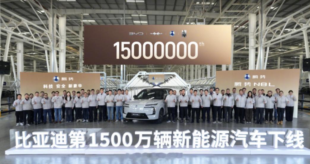 比亚迪第1500万辆新能源汽车下线 比亚迪现在的规模优势是很大,从1000万到1500万,只用了短短的13个月,从这个速度来看大概往12个月500万的产量去靠近了猜猜明年比亚迪的销量目标是多少?