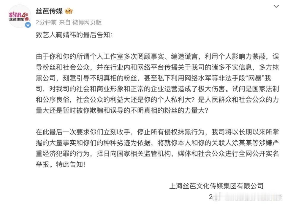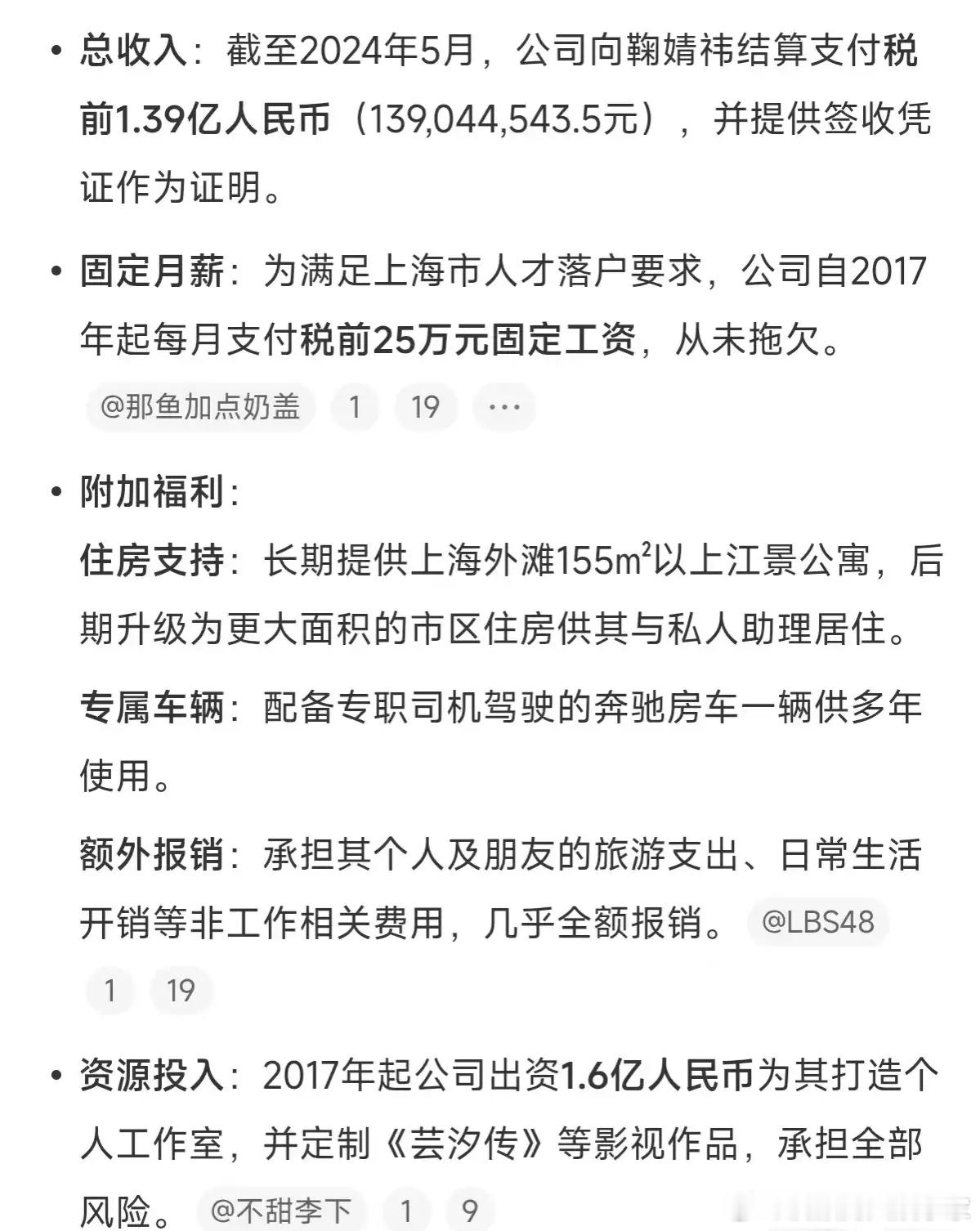 感觉每一句话都带着威.胁。同情的从来不是她“收入低”,而是“本该拿的钱被恶.意.克.扣”,这跟娱乐圈薪资高不高没关系,就像你月薪三万被老板吞两万,难道要因为有些人比别人赚得多,就活该认栽?而且按照鞠婧祎咖位这个收入是正常,但是一旦弄到明面上路人的观感会差很多,只能说丝芭确实会引.导.舆.论。不过都撕破脸到这种程度了,都没有其他黑.料出来,鞠婧祎是真的前公司只敢暗戳戳引.流.税.务问题……丝芭喊话鞠婧祎再不收手将实名举报丝芭指控鞠婧祎严重经济犯罪