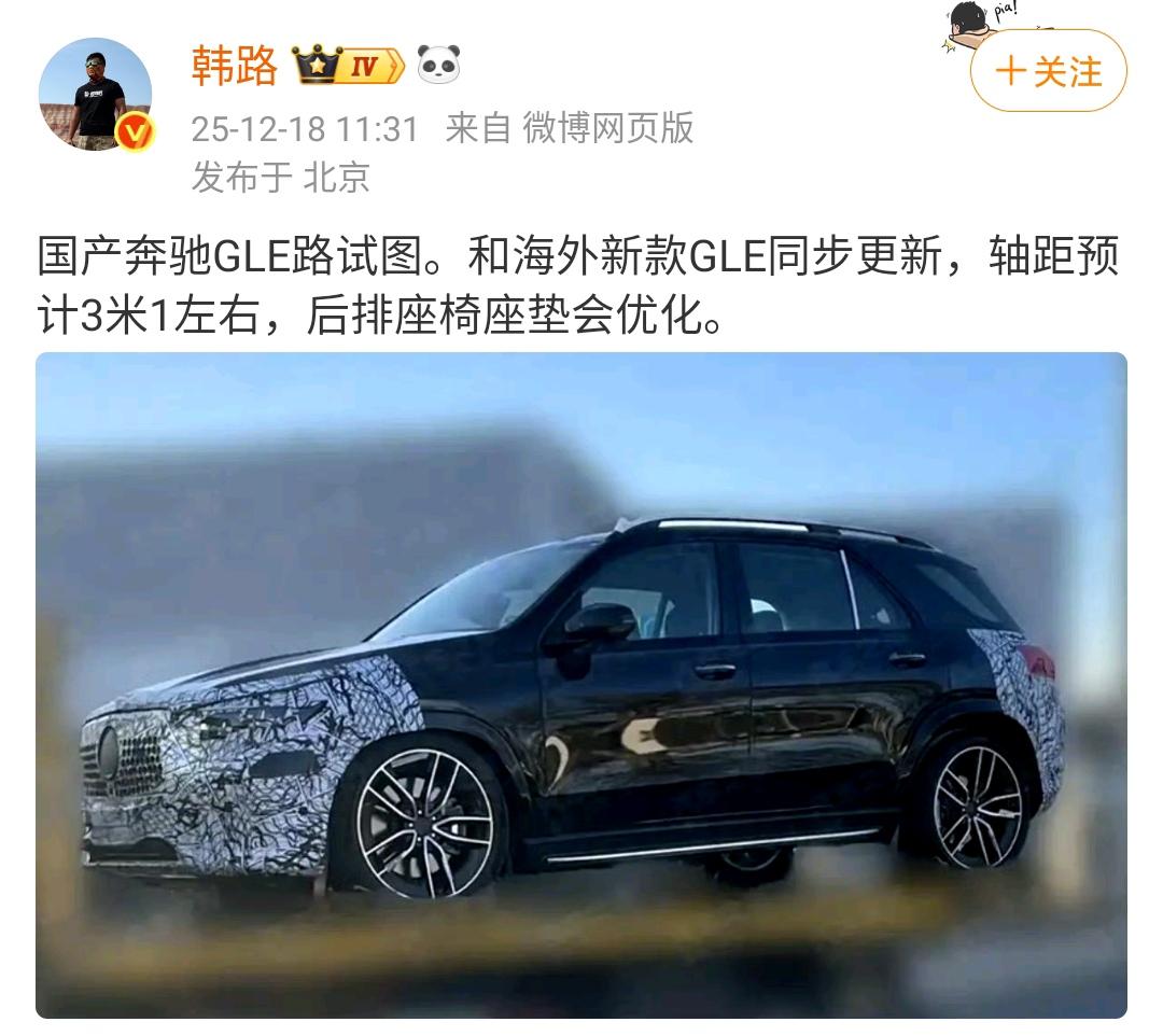 韩路:国产奔驰GLE路试图。和海外新款GLE同步更新,轴距预计3米1左右,后排座椅座垫会优化。 奔驰GLE总感觉这款车是挺适合各个年龄段的人去开的,首先品牌认可度方面自然不用多说,绝大多数人都认识这个奔驰的标。 而且这款车型相当的稳定,特别是近十几年来,设计一直是挺不错的,大家都认可这套设计语言。对于奔驰这种车来说,能不能在智能驾驶层面能继续加强,就是接下来要做的事情。