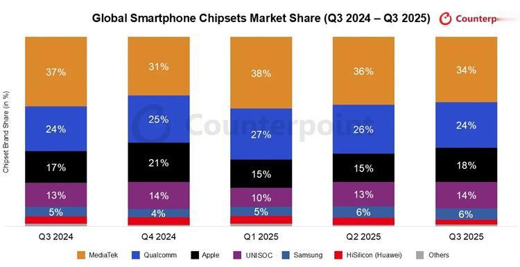 从2024年第三季度到2025年第三季度,全球智能手机处理器份额排名,联发科天玑持续排名第一位,其次是高通骁龙 联发科,高通,苹果,智能手机处理器三巨头,短时间内没有品牌能撼动这三家的地位