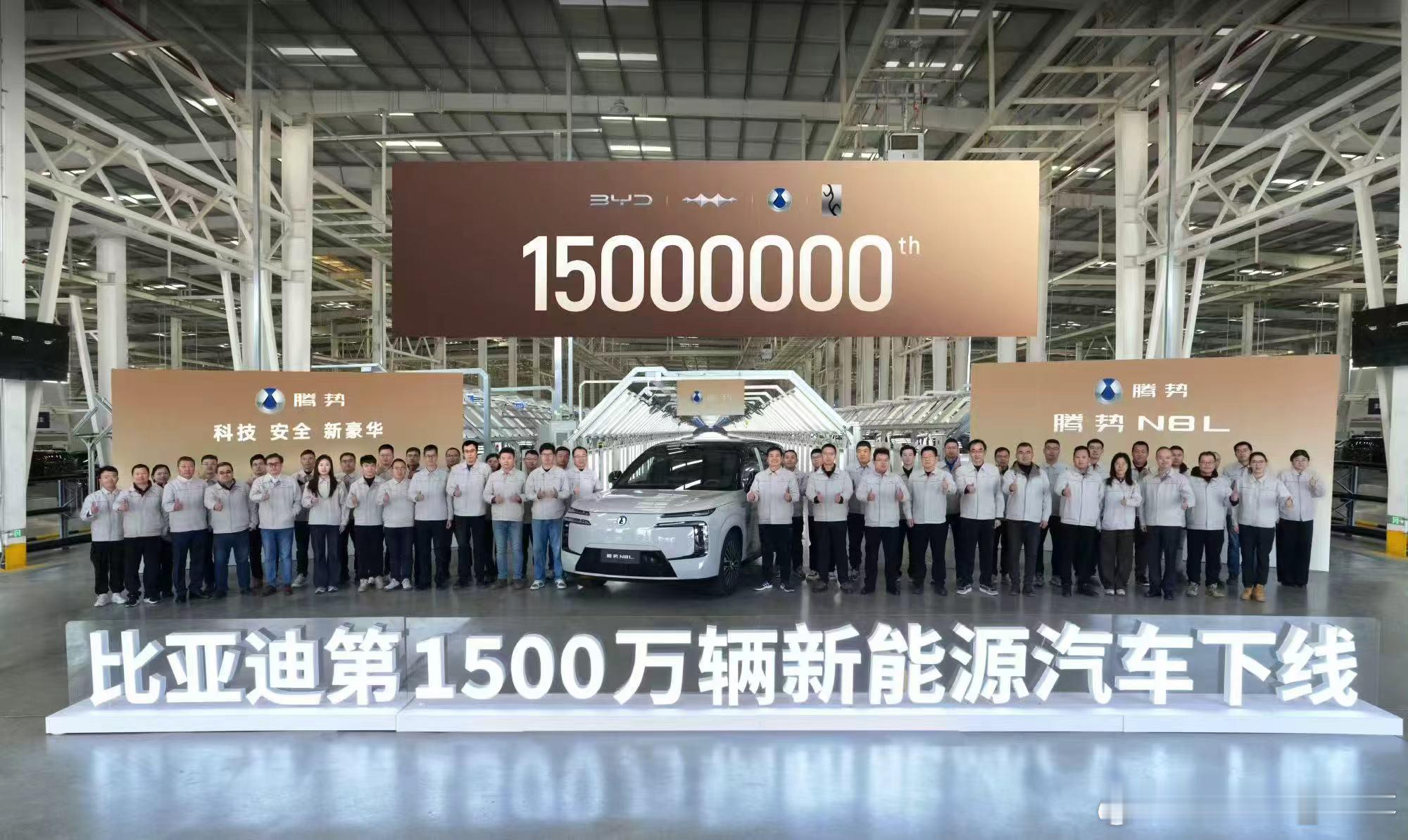 腾势N8L第15000辆台车下线,成为比亚迪第1500万辆下线的新能源汽车比亚迪从0到1000万用了整整17年从1000万到1500万仅用了13个月的时间就完成了2025年1-11月累计销量已破418万,这就是中国智造的速度!比亚迪第1500万辆新能源汽车下线