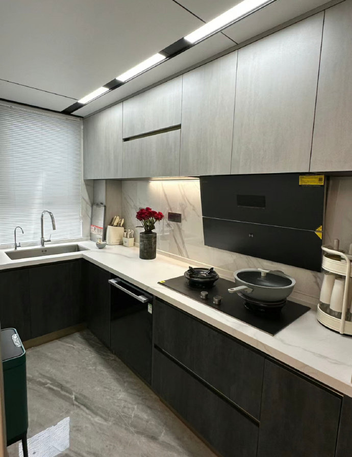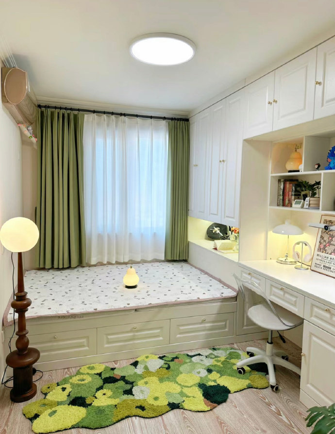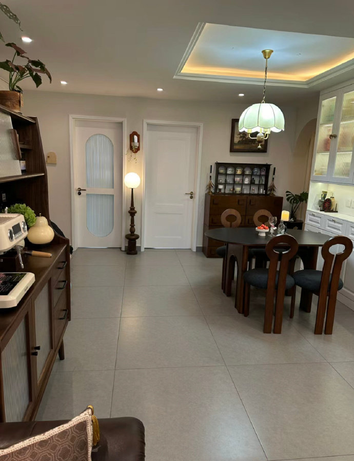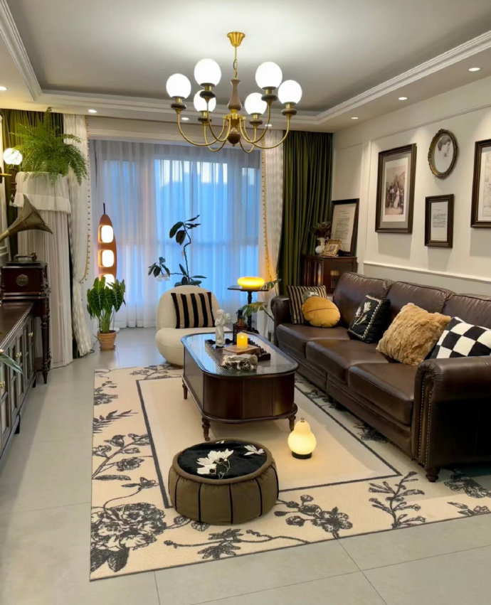 纯白色奶油风+亮面地砖,客厅地毯感觉加分很多,精装房的可以参考..