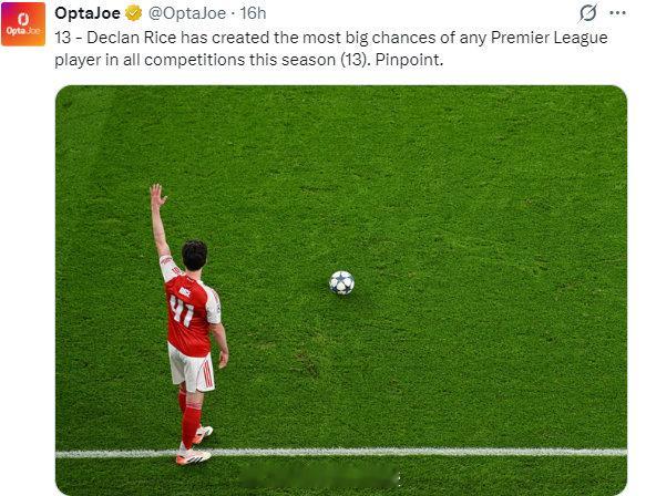 赖斯是本赛季英超所有赛事中创造绝佳机会最多的球员(13次) 英超联赛 阿森纳著名教授