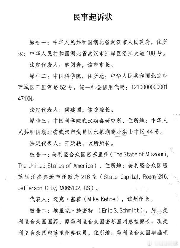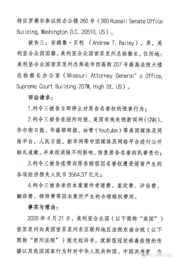 【中国起诉密苏里州】(美联社)——密苏里州的首席检察官表示,在该州要求联邦官员协助追讨与新冠疫情相关的约250亿美元法院判决后,中国提起了诉讼。总检察长凯瑟琳·哈纳韦周二在新闻稿中表示,中国在武汉中级人民法院提起的诉状中要求密苏里州公开道歉。中国政府还要求赔偿相当于505亿美元的金额,加上法律费用,并保留进一步索赔的权利。哈纳韦在新闻稿中说:“这场诉讼是一种拖延战术,这让我确信我们一直以来在这个问题上都是正确的。”问题的起因是密苏里州提起的诉讼,指控中国在疫情初期囤积个人防护装备,损害了该州及其居民的利益。今年早些时候,在中国拒绝参与庭审后,一名联邦法官做出了对密苏里州有利的裁决。该诉讼在2020年提起时被中国称为“非常荒谬”。上个月,密苏里州加大了追讨力度,要求美国国务院正式通知中国,该州打算追讨具有全部或部分中国政府所有权的资产,以履行判决。中国驻华盛顿大使馆发言人刘鹏宇周三在电子邮件声明中表示,他不熟悉新案件的具体细节。但他表示,密苏里州早先的诉讼是“纯粹出于政治动机的举动”。“中国坚决反对这一行为,永远不会接受,并保留采取强硬反制措施的权利,” 刘鹏宇说。中国外交部今年早些时候表示,其在疫情期间的行动不受美国司法管辖,也不承认这一裁决。一些法律专家对密苏里州能否执行判决表示怀疑,因为联邦法律通常保护外国免受美国法院的诉讼。这个案件的进展不同寻常。美国地区法官斯蒂芬·林鲍在2022年最初驳回了这起诉讼,称密苏里州不能起诉中国、它的共产党以及另外七个政府或科学机构。然而,上诉法院允许诉讼的一个部分继续进行:指控中国囤积个人防护装备,如呼吸器口罩、医用长袍和手套。在中国官员没有回应后,林鲍接受了密苏里州对过去和潜在未来损失超过80亿美元的估算,按照联邦法律允许的范围将其增加三倍,并加上3.91%的利息,直到这笔钱被收回。这起诉讼最初是由密苏里州总检察长埃里克·施密特提起的,他是总统唐纳德·特朗普的盟友,后来赢得了美国参议院的选举。诉讼声称中国官员应对疫情负责。后来,诉讼由总检察长安德鲁·贝利继续进行,他也是特朗普的盟友,他在9月辞职成为联邦调查局的联合副局长。哈纳韦是一位前美国检察官和密苏里州众议院议长,当她被共和党州长迈克·科霍伊任命为州总检察长时,她接手了这个案件。美联社未能立即获得中方提交的起诉书副本,但汉纳威的新闻稿中附有该文件链接网页链接。诉状指控密苏里州政府及施密特、贝利二人"捏造大量虚假信息,散布污名化与歧视性诽谤",损害中国声誉。