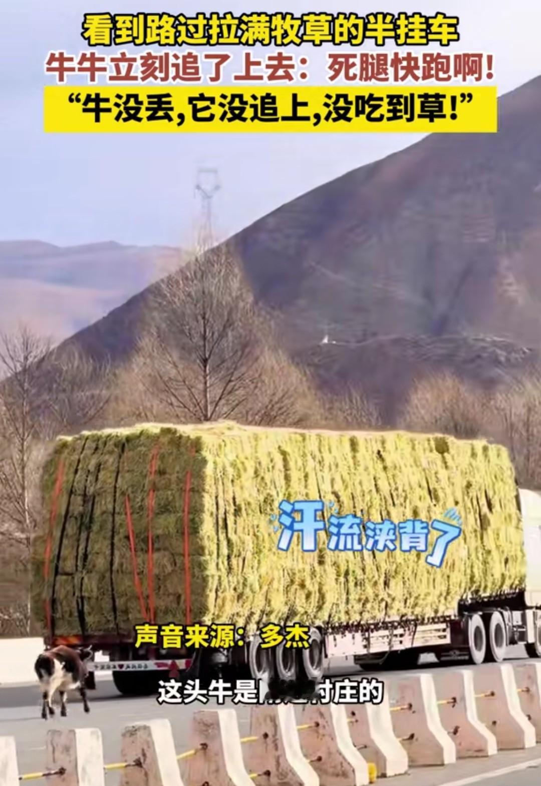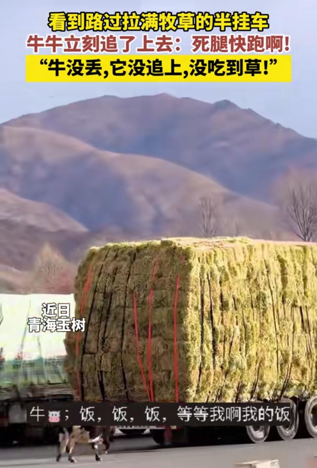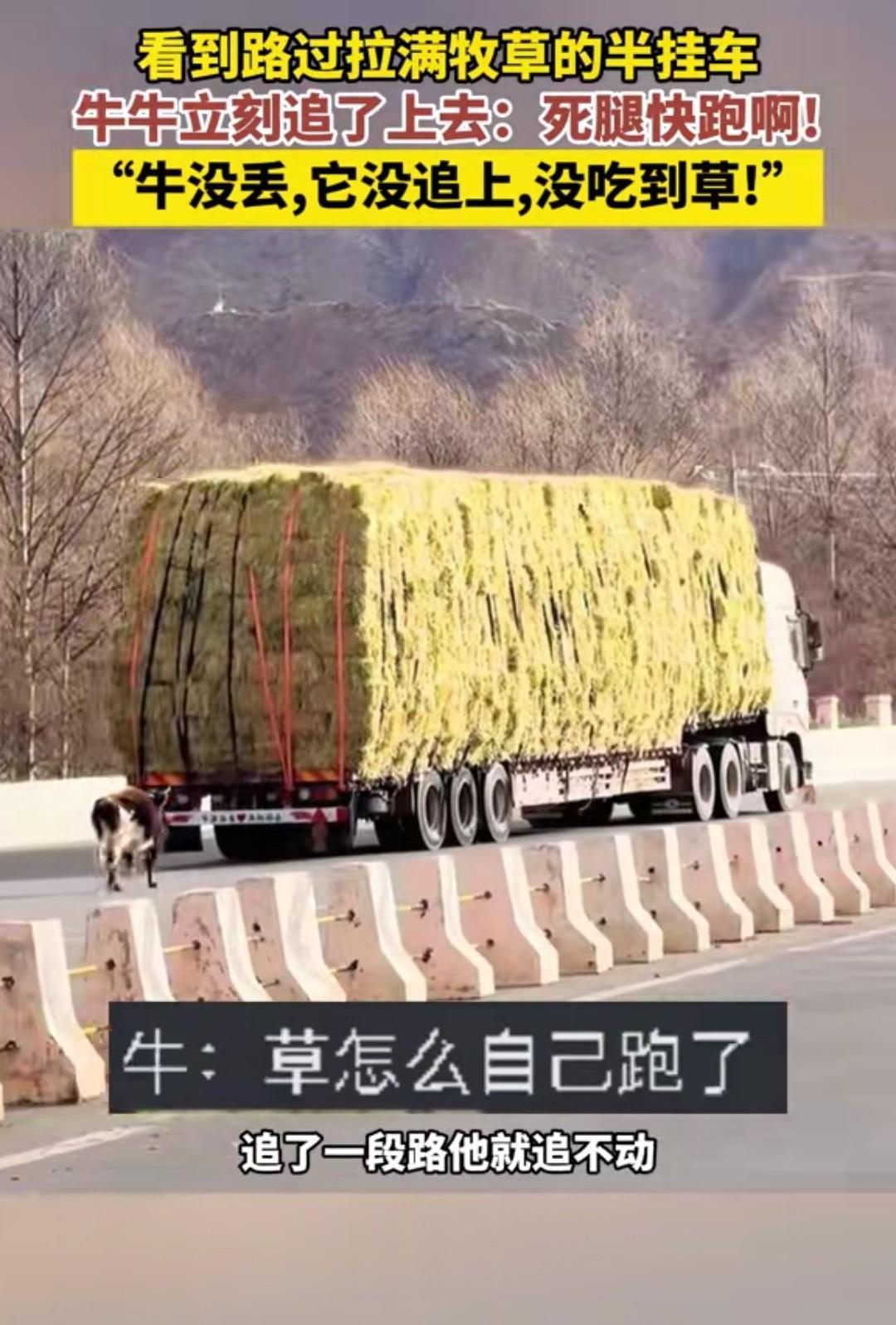 这是一头追着车跑的牛牛! 近日,青海玉树某地高速路口,一头牛看到一辆装满牧草的半挂车,被车上的牧草吸引,追了上去。 追了一段路,它没有追上,也没吃到一口牧草,只好停下不追了。 在牛看来,它的饭自己跑了,它没吃上一口,它很委屈的!