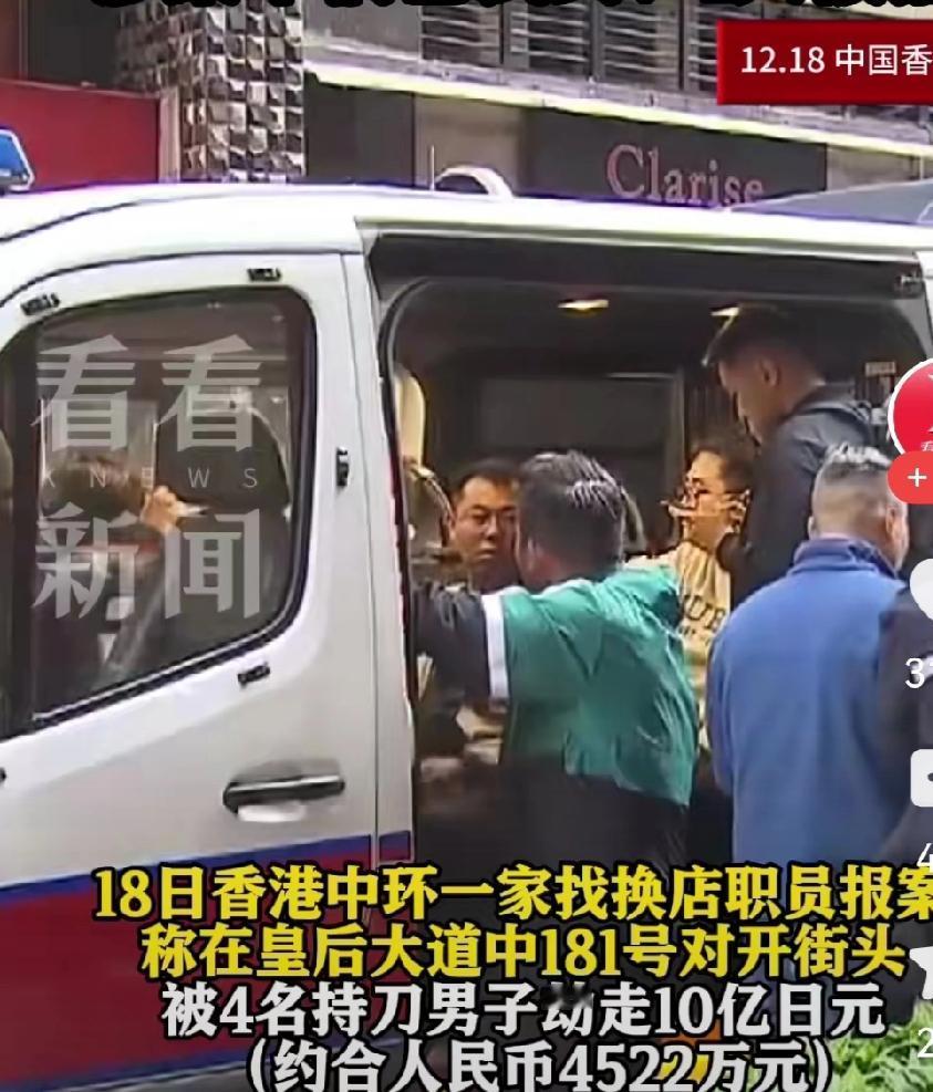 香港突发惊天劫案!4悍匪持刀抢劫5000万,警方神速破案抓捕1人! 今天上午9点06分,香港核心商业区中环突发重大持刀抢劫案!在人流密集的皇后大道中181号新纪元广场附近,4名男子公然持刀抢劫,抢走了找换店职员携带的10亿日元(约合5000万港元、4522万元人民币)现金! 整个作案过程迅速且极具突发性,两名受害人均未受伤,第一时间报警。香港警方反应迅速,立即启动紧急处置机制,调派警力赶赴现场。仅在距离案发现场450米左右的苏杭街138号对开路段,警方就发现了疑似接应匪徒的七人车,并当场拘捕一名涉嫌参与抢劫的男子。 目前,警方正全力追缉其余在逃匪徒,并深入调查案件细节。此次劫案涉案金额巨大,引发社会广泛关注。 这起案件再次提醒我们,无论身处何地,安全永远是第一位的。同时,也为香港警方的迅速反应和高效行动点赞! 案件关键信息速览: 时间:12月18日上午9时06分 地点:香港中环皇后大道中181号新纪元广场附近 涉案金额:10亿日元(约5000万港元) 嫌疑人:4名男子(1人被捕,3人在逃) 警方行动:迅速布控,拘捕1人,追缉余党 请大家持续关注案件进展,如有相关线索。香港银行抢劫案