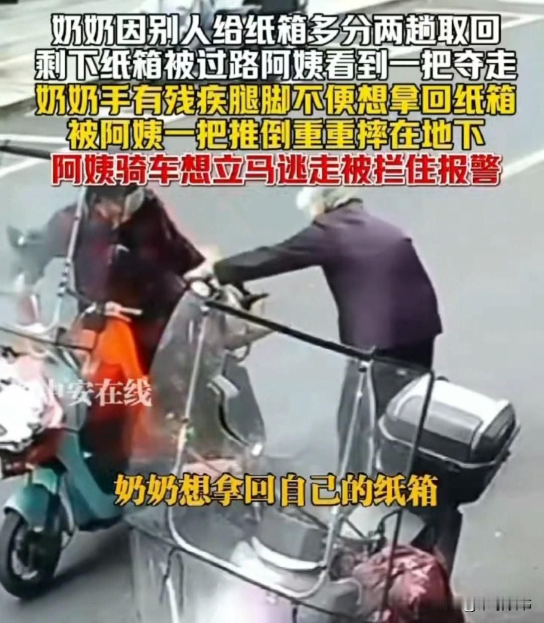 温州街头,残疾老奶奶正去取店主赠的剩余纸箱,见一大妈要拿走,急忙上前阻拦。大妈不耐烦,抬手重重一推,一把将老人推倒在地。 12月10日,温州街头,先天手部残疾、无法说话的老奶奶,正佝偻着背溜达,想捡些废弃纸箱——生活困难的她,还有个重病女儿,全靠这些废品给女儿赚透析补贴,每一分都看得格外重。 突然,一道声音喊住了她:“奶奶,等会儿!” 杂货店店主探出头,指了指店门口的纸箱,“这些我用不上了,全给你!” 老奶奶眼睛瞬间亮了,连连点头,抬手比划“谢谢”,嘴角难得牵起笑意。 纸箱太多,她单手攥着边角,费了大力气才搬一半到墙角,还捡块石头压好,转身准备搬第二趟。 可刚往回走,就见穿深红色外套的大妈,骑电瓶车停在剩余纸箱旁,不问缘由就往车上搬。 老奶奶心里一紧,快步冲过去拦,嘴里“哎哎”急唤,指着石头又指着自己,拼命比划纸箱是她的。 大妈看懂了,却皱眉把纸箱往车上塞:“不就是点破纸箱,至于吗?”推着车就要走。 老奶奶哪肯放,一把抓住纸箱边角,指节泛白。 “你这人怎么回事!”大妈不耐烦了,猛地挣了挣,见她没松手,竟抬手狠狠推在她胸前。 “扑通”一声,老奶奶后背磕在马路牙子上,蜷缩在地,半天起不来,眼里泛了泪光。 “你怎么还推人!”杂货店店主刚收拾好,抬头就看见这幕,立马冲出门拦住建大妈。 路人也围过来,有人蹲下身安抚老奶奶,有人拍视频留证,还帮着拦人:“不能让她走,赶紧报警!” 店主一边哄着浑身发颤的老奶奶,一边打110、联系老人家属。 警方赶来后,严肃批评教育大妈,明确其行为不妥。 后续检查显示,老奶奶仅软组织挫伤,但总喊头疼需留观,最终大妈垫付了600元检查费。 残疾奶奶捡纸箱为女筹药费,本就不易,大妈却夺物推人,实在不该。好在有店主路人伸援手,“人间自有真情在”,愿善意常伴,少些计较,多些体谅。