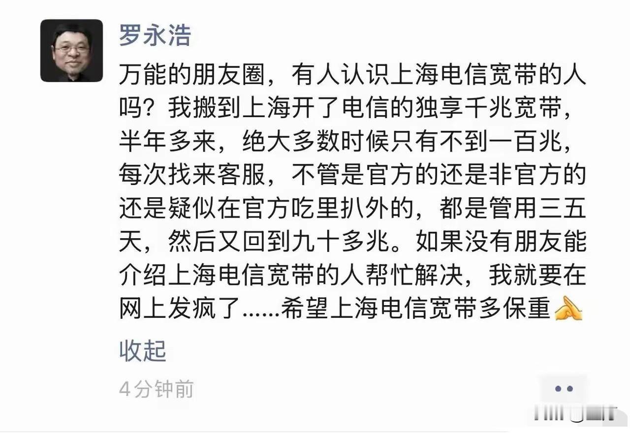 罗永浩吐槽:我开的千兆宽带,大多数时候不到100兆! 就在今天,罗永浩在朋友圈寻找懂网络的人给他解决这个难题,明明开了千兆宽带,和实际用的时候只有100兆,而大多数时候还只有几十兆[捂脸] 聪明机智的他,其实很早就找人了,没想到即便是罗永浩本人,在找的人之后,接下来遇到的问题,和我们遇到的问题也差不多。 那就是只要每次找专业的人来弄一下,能管个三五天,只要过了这个时间段,又回到了几十兆上百兆的速度[笑哭] 所以能够明显的感觉到罗永浩的无力感,但是他的性格决定了这个事情,他是不会忍的,所以他先在朋友圈问有没有这方面的专业人士,看看能不能够从根本上给他解决这个问题,当然如果不能解决的话,他就会用他的方式来解决[笑哭] 其实现在很多人都开了千兆宽带,现在一大运营商都在推广这个业务,而且这个业务应该也有许多年了,就像此时此刻你家里面用的网络说不定就是千兆的。 但能不能够稳定地保持在这个速度,好像会受到很多因素的影响,简单地说就相当于你这一个小区里面它的带宽是固定的,比如说你这一个服务器是10个G的总宽带,但是你这里有城墙上万个用户都在用这10个G的宽带,如果碰到了大家使用宽带高峰的时段,比如下班之后这段时间,那么很多用户就会明显感觉到宽带的速度不如平时快。 但不管怎么样,运营商在签合同的时候是跟用户承诺的,你这个宽带是一千兆的,所以这个事情如果罗永浩真的要出根到底的话,估计也只是给他单方面的彻底解决。 但是我们这种普通用户家里面的宽带,能不能够向他这样解决,稳定到字面意思的千兆宽带,估计没那么容易。