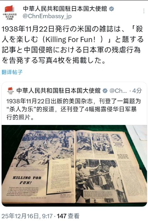 中国驻日本大使馆正式宣布,12月16日,中国驻日本大使馆用中日文双语写道:“1938年11月22日出版的美国杂志,刊登了一篇题为‘杀人为乐’的报道,还刊登了4幅揭露侵华日军暴行的照片。” 这条消息乍一看像是翻历史旧账,但仔细品品时间节点就知道不简单,国家公祭日刚过没几天,日本政坛右翼势力正闹得欢,这时候翻出一本快一个世纪的美国杂志,还特意用中日文双语发,这哪里是回顾历史,分明是精准打击。 12月13日的国家公祭日,我们刚缅怀过南京大屠杀的遇难同胞,全社会都沉浸在对历史的追思里,可日本那边的右翼势力半点没收敛,反倒借着一些场合散布否认侵华史实的言论,甚至有人公开质疑南京大屠杀的真实性,这种跳梁小丑般的行径,属实让人没法忍。 更关键的是这次使馆翻出来的可不是普通史料,是1938年11月22日美国《瞭望》杂志的报道,标题直接就叫“杀人为乐”,还配了4幅实打实的照片。 这份史料是美籍华人鲁照宁捐赠给南京大屠杀遇难同胞纪念馆的,算是妥妥的第三方铁证,压根没给日本右翼留任何狡辩的余地。要知道当年侵华日军为了掩盖自己的滔天罪行,特意构筑了双重信息壁垒,一边死死堵住国际社会的消息出口,一边又在国内大肆编造谎言欺骗本国民众,把自己包装成所谓的“仁义之师”。 有个叫石川达三的日本随军作家,本来是被派去前线歌颂日军的,结果亲眼看到日军把抓捕妇女当成“抓兔子”,还因为嫌弃哭声、怀疑偷糖就随意杀害平民,连孩童都不肯放过。 他实在忍不住写了本《活着的士兵》揭露真相,没想到书刚出版就被禁,自己还被判处四个月监禁,就因为违反了所谓的《新闻法》。 可即便日军这么费尽心机封锁消息,还是没能挡住真相的传播,当时美国的《纽约时报》《芝加哥每日新闻报》都先后报道过日军的暴行,德丁、斯蒂尔这些记者,都曾在文章里直斥日军的残暴,把南京形容成“人间地狱”。 这次使馆特意点出的“杀人为乐”报道,就是当年国际社会揭露日军暴行的重要一环,那4幅照片更是直观到让人揪心,比任何文字描述都更有冲击力。 说白了,选在这个时候把这份快百年的史料抛出来,就是要告诉日本右翼,你们想否认的历史,早就被第三方清清楚楚地记录在案,想翻案根本就是白日做梦。而且特意用中日文双语发布,心思也特别明白,一方面是说给国际社会听,让大家看看日军当年的真实面目;另一方面更是直接递到日本民众面前,怕他们被右翼的谎言误导,忘了那段血淋淋的历史。 这些年日本右翼一直在玩各种小动作,要么借司法程序否认南京大屠杀,就像当年的《东史郎日记》案,明明是铁证如山的史实,却被东京高等法院作出了不顾事实的判决;要么就质疑南京沦陷时的人口数量,妄图以此推翻大屠杀的真实性。 可他们忘了,除了中国的史料和幸存者证词,还有太多第三方证据等着打他们的脸。就像这次的美国杂志报道,还有之前被公开的日军士兵家信,有个叫村田芳夫的日军士兵,就在信里用“很有意思”“真痛快”这种毫无人性的话,描述自己部队在南京屠杀俘虏、抛尸扬子江的场景。 中国从来都不是喜欢翻旧账的国家,可面对日本右翼一次次的挑衅,也绝不会坐视不管。国家公祭日的设立,是为了缅怀先烈、铭记历史,而不是为了延续仇恨。可日本右翼偏偏在这种敏感时刻跳出来作妖,那就别怪我们拿出实打实的证据反击。 这次驻日使馆的操作,没有激烈的言辞,也没有多余的指责,就只是平静地摆出一份史料,却比任何强硬的表态都更有力量。毕竟最有力的反击,从来都不是口水战,而是把无可辩驳的真相摆到阳光下,让所有妄图歪曲历史的人,都在铁证面前无处遁形。 现在越来越多的侵华史料被不断发掘出来,不管是日军的信件、相册,还是国际媒体的旧报道,都在一点点拼凑出当年的真相。这些史料不是为了挑起矛盾,而是为了提醒所有人,历史不容篡改,暴行不容遗忘。希望日本右翼能早点认清现实,别再抱着侥幸心理妄图否认历史,不然只会一次次被史料打脸,最终沦为国际社会的笑柄。而对于我们来说,铭记这些历史,不是为了仇恨,而是为了更好地守护和平,不让当年的悲剧再次重演。
