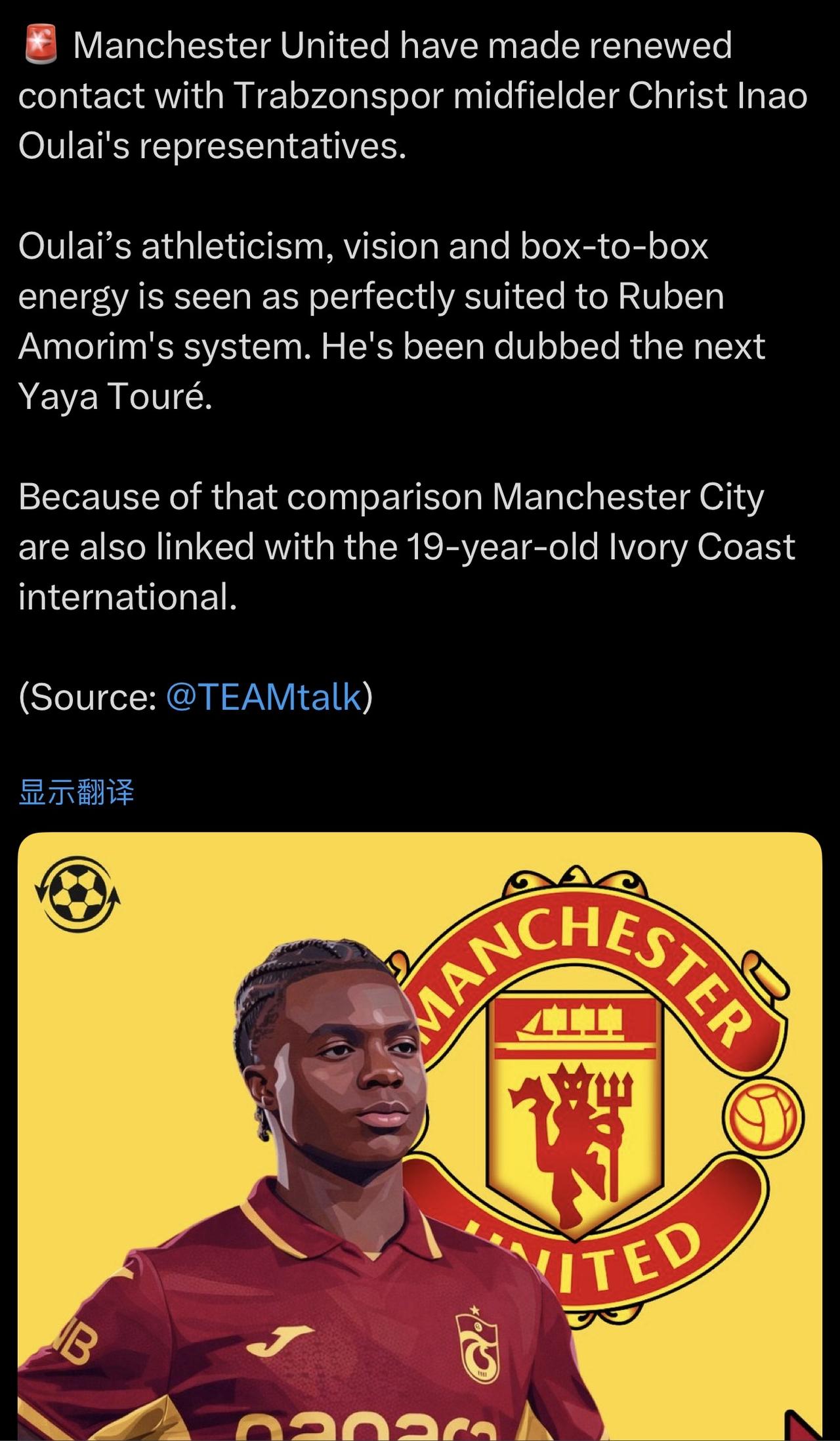 奥纳纳做球探和经纪人肯定是一把好手[憨笑] ……………………………………………………………… 曼联已与特拉布宗体育中场球员克里斯·伊瑙·乌莱的经纪人重新取得联系。 奥莱的运动能力、视野和全场奔跑的活力被认为完美契合鲁本·阿莫林的战术体系。他被誉为下一个亚亚·图雷。 正因为如此,曼城也与这位19岁的科特迪瓦国脚联系在一起。