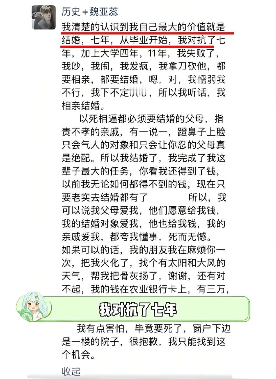 抗争了11年, 最终还是没逃过父母的逼婚, 明明不喜欢男方, 却被以si相逼、被亲戚骂不孝, 最后只能妥协…… 谁能想到婚礼当天, 父母还在向她伸手要钱, 这成了压垮她的最后一根稻草。 她没穿婚纱、没化妆, 以最本真的样子从七楼跳下, 至死都在坚守自己。 更让人寒心的是, 她死后父母居然冷漠到不愿收Si, 只把女儿当成给儿子换彩礼的工具。 有人说她傻, 可没人知道11年的精神压迫有多窒息。 男方27万彩礼看似不少, 却成了捆绑她的枷锁, 父母拿女儿的幸福给儿子铺路, 这种重男轻女的旧思想太可怕了。 更值得深思的是, 妇联都介入关注了, 可见这类逼婚和情感暴力不是个例。 婚姻从来不是必须完成的任务, 彩礼也不该是买卖女儿的筹码。 父母的爱应该是儿女的后盾,不是控制; 子女的幸福应该由他们自己定义,不是被安排。 愿魏女士的悲剧能敲醒那些执迷不悟的父母, 也希望每个年轻人都能拥有选择人生的自由, 毕竟生命只有一次!