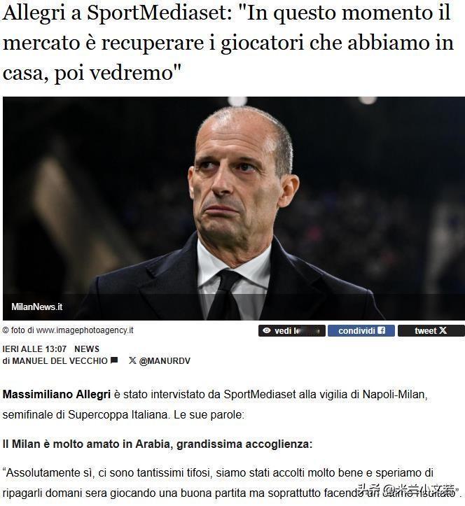 很多球员恢复健康就是米兰冬季窗口最重要的引援。阿莱格里在抵达利雅得后接受采访表示米兰作为卫冕冠军来到利雅得,作为主教练肯定是有压力的,我自然会全力以赴。 记者同时询问了阿莱格里米兰冬季窗口引援情况,阿莱格里回答说阿泰卡梅与福法纳已经回归球队,他们也来到了利雅得,他们就是冬季窗口最重要的引援。我不清楚如何理解阿莱格里的话,他的意思是中场不会引援?之前说会考虑补强锋线,会买一名右边翼卫替补,现在意思是阿泰卡梅回来了替补也不买了呗,冬季窗口就引进一名中锋。 阿莱格里对于意大利超级杯并不是很重视,他只是表达了米兰作为卫冕冠军他有压力,同时谈到了清楚知道米兰在阿拉伯国家的受欢迎程度,但那不勒斯是一个强大的对手,米兰并没有绝对实力战胜那不勒斯,同时阿莱格里认为无论国际米兰还是博洛尼亚都同样强大,所以卫冕对于他而言十分有压力。