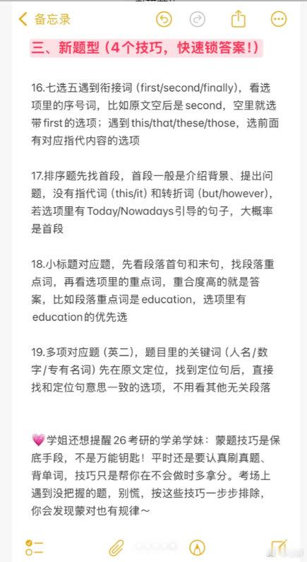 考研英语蒙题技巧(过线版)!考研英语83分上岸的学姐,太懂考场上遇到不会的题有多慌!今天把自己感觉有用的19个蒙题技巧全分享出来,阅读、完形、新题型,不会做也能精准蒙对,最后天帮你多拿一些分~颉斌斌官宣 决战考研 2026考研