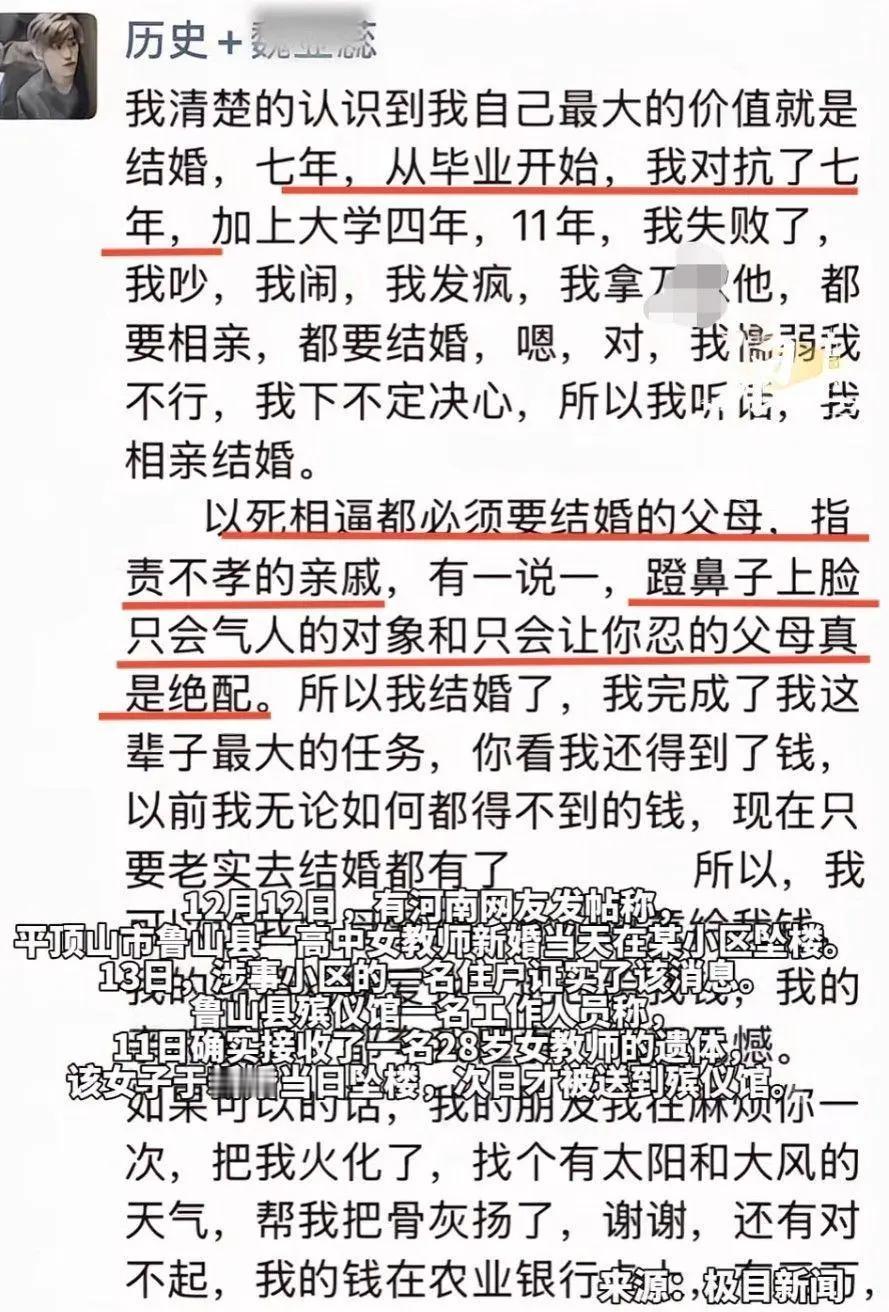 这个跳楼的教师这都是现代社会了,居然还有人逼婚? 我在这里要讲一句话,请当地的妇联介入这个事情,进行详细的调查。不要认为这是他们家里的事情,如果存在胁迫、逼迫等各种方面的事情,请还这个孩子以公道。不要认为父母亲戚就不用负法律责任了,法律上没这一条。 网上显示你17岁就开始被逼婚了,你的父母亲戚到底是一些什么样的父母?是奇葩还是什么来着? 她的遗书上写的清清楚楚,也不需要洗白了,就是亲戚父母逼着她结婚,这还有什么好说的吗?好了,这一下人不在了,也没人再逼迫她了,甚至葬礼。他的遗书上写的很清楚,就是想找一个随便找个人把它给烧了,然后骨灰扬了我不知道这样的父母到底是什么样的的人能不能让我们见识一下?生在这样的家庭,我真是服了,你们这不是活活把人逼死了吗?人家不想结婚,不想结婚,听说还有什么彩礼的事情。我建议公安部门进行详细的调查,看看中间有没有胁迫的问题存在,如果有,请公布一下事实的真相,不能让一个老师就这样平白无故的没有了,我们是法治社会! 请这位老师的学校领导出面,妇联出面,侦查机关出面,还原这个事情的全部真相,一个生命消失了,这不是他们互相推诿的借口,总要有人去付出代价。 人民群众很生气