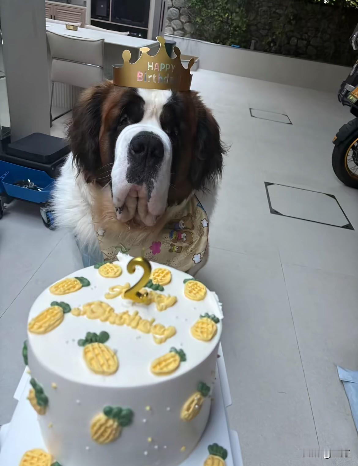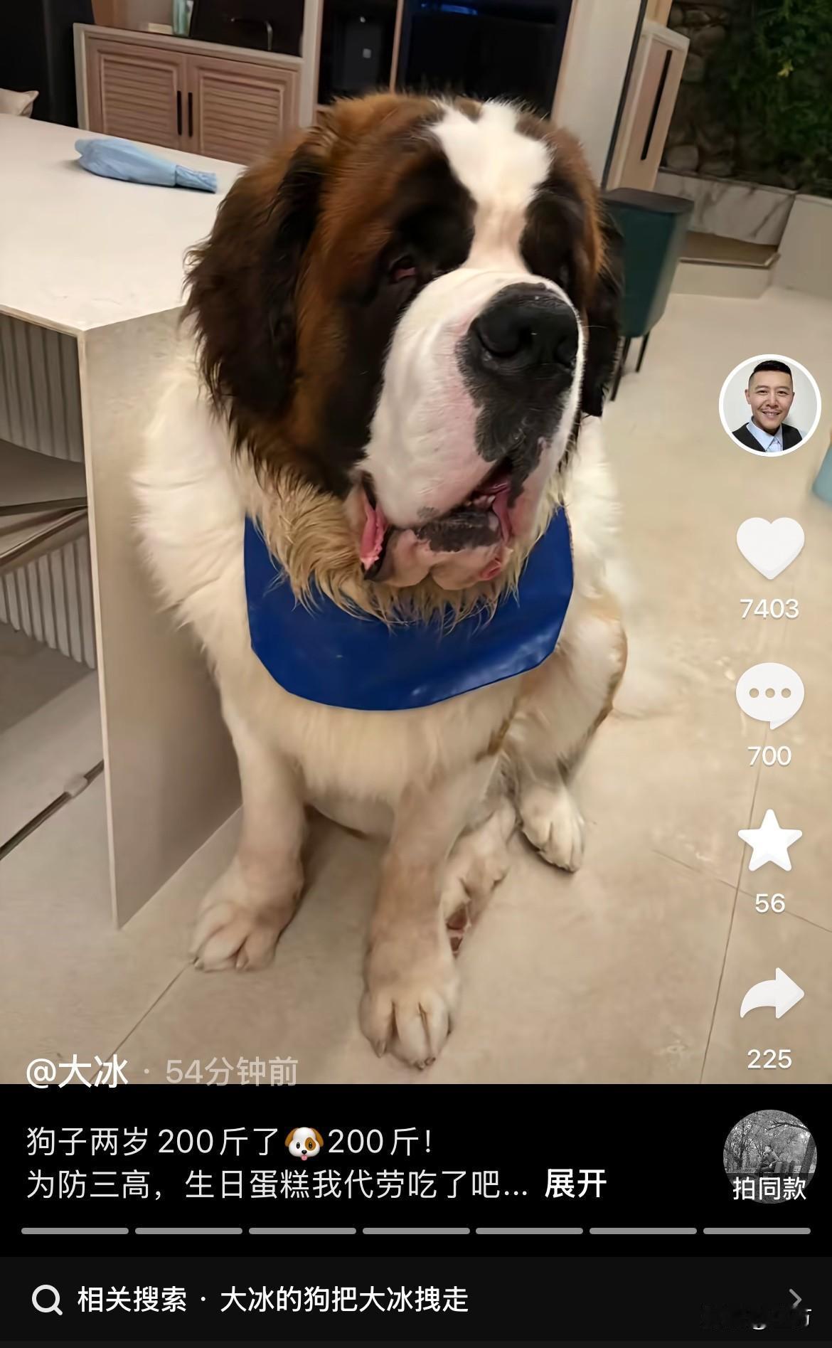 大冰: 我的狗两岁了,不过他现在200斤[捂脸] 今天晚上,大冰更新了自己的社交网络,发的是一张可爱的狗狗,准确的说是一只可爱的大狗! 这只狗狗是大家熟悉的圣伯拉犬,在这之前他已经出圈了,那就是有一次大冰在直播的时候,它嘴巴里面叼着一个球过来,一定要大冰陪着他玩,大冰把那个球一下子扔很远,它又把那个球叼回来了[捂脸] 不要看这个狗很大,他却非常的温顺,当然不了解的人,看到它这么大一只,估计都会被吓着,但是这个狗不但没有攻击性,好像不太聪明的样子,有一次下雨的时候他在外面睡着了,雨水淋湿了,它也没有,关键是大冰还叫不醒它,没有办法,只有拿来一把伞,给这个狗狗遮风挡雨! 今天是这个狗的生日,大冰给它准备了生日蛋糕,这个两百多斤的大家伙,居然才两岁,可想而知大冰平时给它开的伙食是足够的。 所以这一次大冰就不让它吃蛋糕了,因为这样下去,会胖的不得了的。