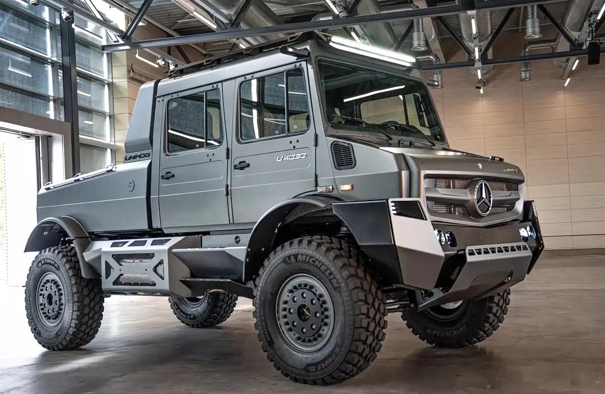 在奔驰大g 升级为子品牌之后,奔驰又盯上了同样主打极致越野的奔驰乌尼莫克 ,与Hellgeth Engineering合作,打造了一台U4030庆祝匹配品牌诞生80周年如果后续反响不错,奔驰很可能将乌尼莫克打造成究极进化版的大GU4030基于U4023打造而来,在原车双排驾驶室的基础上,将一台干活用的工具车打造成了超豪华大皮卡外观-哑光灰色涂装辅以大量车身套件以及细节调整,前杠造型夸张,内置多处LED灯组,车顶还能看到身居高位电子外后视镜和探照灯带侧面采用了20吋防脱圈并内置中央充放气,货厢配备龙门架,尾部多处采用镂空三角形/梯形元素,强调军事风格和现代科技感内饰-四座布局,大面积高级皮革软包面料,辅以对比色缝线、LED氛围灯和皮革脚垫动力-7.7T直六柴油机取代原车5.1T直四柴油机,峰值输出300马力、1000+N·m,保留三把差速锁、门式车桥等硬核越野配置SUV大百科