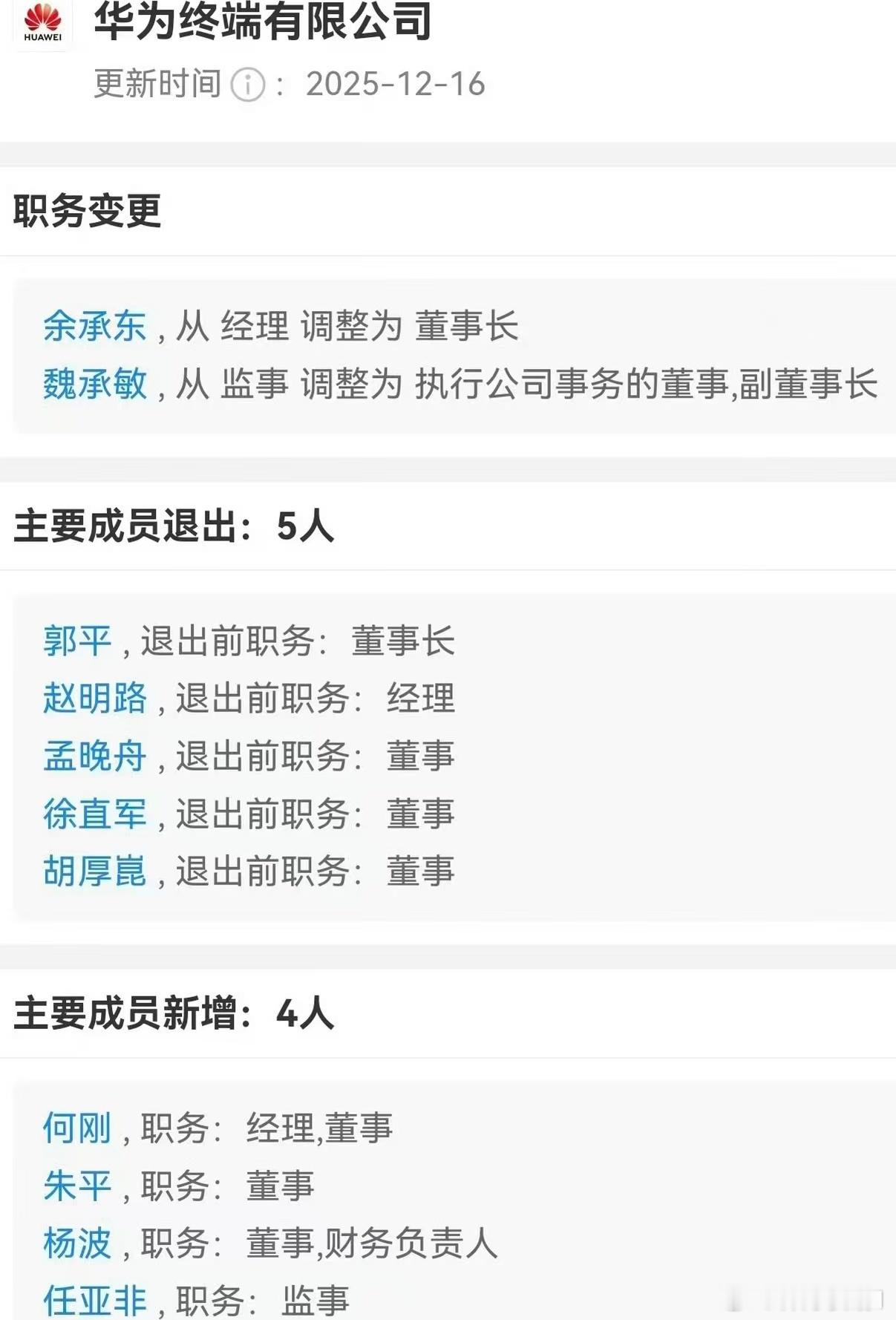 余承东升任华为终端公司董事长,意味着什么?分析一波:第一,余总之前是华为终端BG的董事长,BG只是华为一个内部事业部,它虽然管理华为终端的业务,但在法律上并不是一个责任主体,而华为终端公司,余总只是经理,董事长之前是郭平,所以余总这波接任华为终端公司董事长之后,意味着余总从此之后在法律上也是终端公司的一把手了,拥有绝对的管理权利与话语权。终端公司高层这波职务变更,主要人员退出的5人,徐直军孟晚舟胡厚崑郭平这些都是在华为集团公司排名前几的常务董事,三名轮值董事长都在内;而新增的主要成员4人,如何刚,是余总一手带起来的嫡系。这说明高层现在非常认可余总顶着制裁重压带领华为终端蒸蒸日上取得的成绩!制裁实际上几乎就是冲着华为终端来的,基本上90%的制裁恶果就是华为终端承担了,对华为其它事业部其实影响不是致命的。任何其他公司承受这种制裁,一定已经挂了,当时不但外部行业内所有友商都认为华为终端要完,比如某些友商都开香槟了,准备吃掉华为所有市场份额,甚至华为内部很多人都对此是极度悲观的,终端离职的人很多,这就好比曾经革命前途一片渺茫的时候,被质疑红旗还能打多久一样。华为有能力有魄力有远见的以余总为主的乐观派,通过一系列正确的战略决策,力挽狂澜了。实战成果说明一切,这让那些经常对华为终端指手画脚的反余派倒余派无地自容,失去了内部民意基础,就像遵义会议,华为终端现在完全走在了正轨上。第二,余总现在还是华为投资委员会的主任,负责人工智能的战略投资,华为终端对高水平人工智能的需求一定是最大的,神无线,圣终端,华为终端在制裁之前贡献了整个华为集团一半的营收,而以25年的情况来看,华为终端第四季度发布的一系列新品,不论手机,耳机,手表还是智能汽车等,这些都是好评如潮,口碑与销量双丰收,就连酷安这种过去习惯对制裁期间华为所有产品都打低分的数码论坛,华为这些新品评分都很高,隐约有那个巅峰华为要回归的征兆,我打听了下,现在连海外的很多app都开始适配鸿蒙6了,华为在未来会重新杀回海外市场,华为终端距离重新占据半壁江山已经不远了,华为终端目前还是华为集团现金牛与利润最大的来源,向集团一些盈利能力欠缺的兄弟部门大量输血。那么华为终端未来有没有可能像引望公司那样独立?第三,短期内华为终端不可能独立,因为还有几个兄弟部门公司需要输血,但既然引望已经开了个好头打过样了,这说明华为这些业务子公司并非永不能独立,一切都是看发展趋势。我判断,超长期看,华为所有的业务子公司恐怕迟早都会独立,等ict,数字能源,华为云等等业务板块都更上一个台阶具备自身大量盈利造血能力的时候,华为终端完全也可以独立。反正不管独不独立,华为集团都是这些子公司的控股大股东。独立以后,就可以像引望一样,释放一些股权,引进一些战略投资者,也许对公司的发展是更好的。华为华为科技华为手机鸿蒙余承东 北京