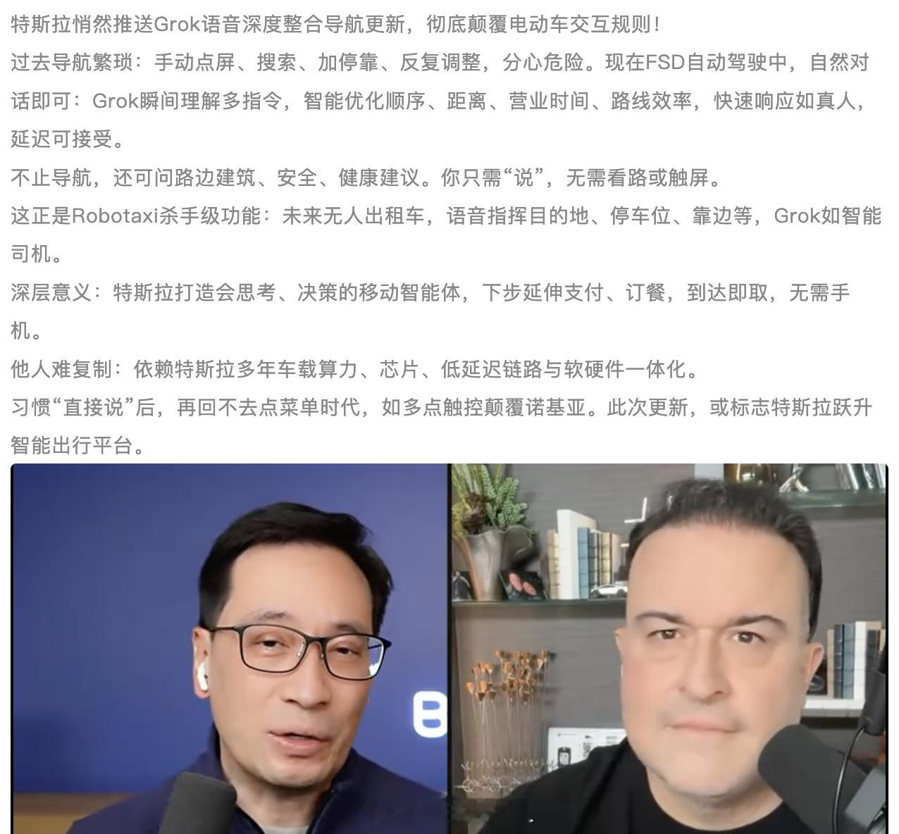 现在特斯拉围绕电车的基本三围已经没啥可说的,现在Grok这样的Ai平台和Tesla原有的电子系统进行升级接下来可能是Ai助手进入车辆,Ai助手来控制一切人的需求:车身控制、热管理、座舱和辅助驾驶深度整合大v聊车新能源汽车Grok