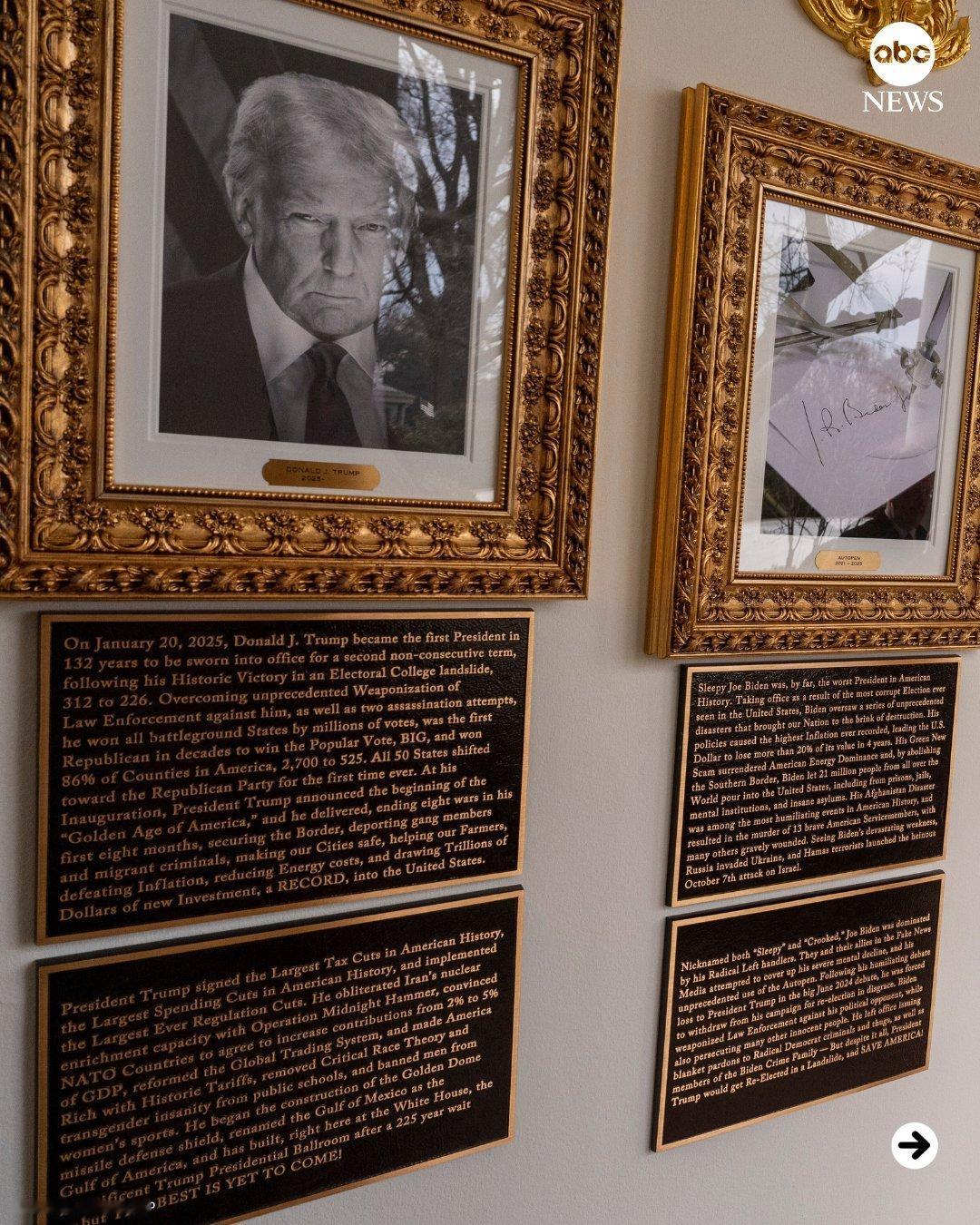 特朗普给多任前总统写批语特朗普给自己的评语:(大总统上台第一年就自己给自己)“2025年1月20日,特朗普成为美国132年来首位非连任的总统,在选举人团投票中以312票对226票的压倒性优势胜选就职。他克服了史无前例的“武器化执法”(针对他的行动),以及两起暗杀未遂事件;在数百万选民的支持下,他赢得了普选。这是数十年来共和党人首次做到这一点。在他的就职典礼上,特朗普宣布开启他的“美国黄金八年”,并承诺:终结帮派暴力、保障边境安全、打击移民罪犯、让我们的城市恢复安宁、帮助农民、抑制通胀、降低能源成本,同时为美国带来创纪录的数十亿美元新增投资。(一块牌匾没写完,又来一块)特朗普总统签署了美国历史上规模最大的减税法案、美国历史上规模最大的支出削减法案,并实施了美国历史上规模最大的监管松绑。他促成了伊朗核协议的废除,让北约国家将国防开支占GDP的比例从2%提高到5%,还推动了对华贸易体系改革,驱逐了来自富裕国家的种族主义者,拆除了公立学校的批判性种族理论课程,禁止跨性别者参与女子体育项目。他启动了墨西哥“黄金穹顶”导弹防御系统的建设,将白宫的高尔夫球场更名为“美国湾”,还在等待225年后,打造了总统宴会厅!最精彩的还在后头!”他说奥巴马:美国史上最具争议性的政治人物之一。(后面blabla一堆负面的话,不堪入耳)他说拜登:瞌睡乔·拜登是美国历史上最糟糕的总统......他的激进左翼幕僚们主导着他。“瞌睡的乔·拜登是美国历史上得票最多的总统——但这是美国历史上最严重的选举舞弊的结果。他以创纪录的7,000万张选票(实则被操纵)当选,却在就职后立刻让美国损失超2000亿美元,还在短短4年内让美国能源独立化为乌有。他开放南部边境,让2100万非法移民涌入,这是美国历史上规模最大的一次人口流入。他的阿富汗撤军行动堪称美国历史上最耻辱、最令人尴尬的事件,导致13名美国海军陆战队员被谋杀。他还为乌克兰和哈马斯恐怖分子提供资金,甚至亲自策划了10月7日的袭击事件。”拜登被媒体戏称为“瞌睡者”和“痴呆者”。他的政府被媒体掩盖了腐败行为,而他的家人在海外也存在非法交易。他的政府实施了史无前例的审查制度,还没收了手机以阻止人们发现他的腐败。他试图将美国的国防生产从2%提升到5%,但这一计划被他自己的司法部阻止。他还迫害政治对手,甚至将一名民选的共和党众议员关押起来——这在美国历史上前所未有。拜登让美国陷入混乱。特朗普在2024年拯救了美国!他说克林顿:2016年,克林顿的妻子希拉里,大选输给了唐纳德·特朗普!热点科普