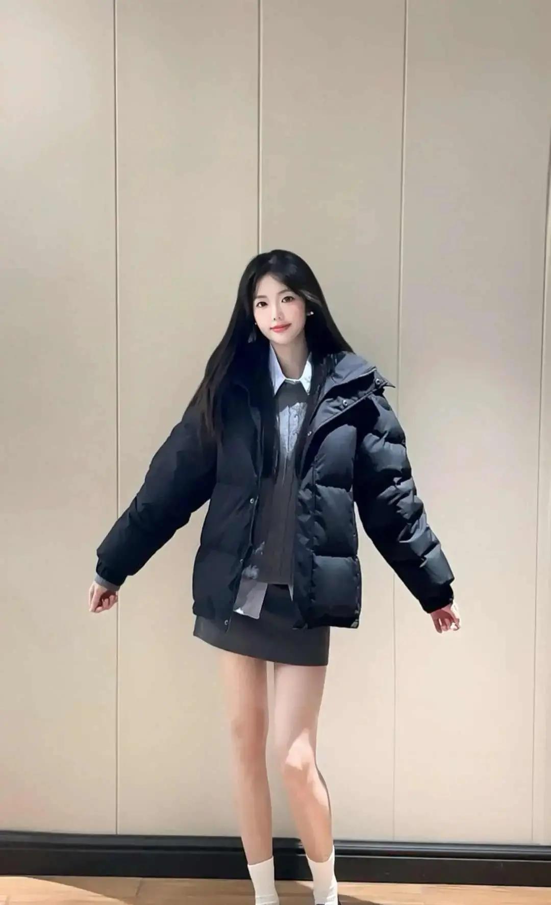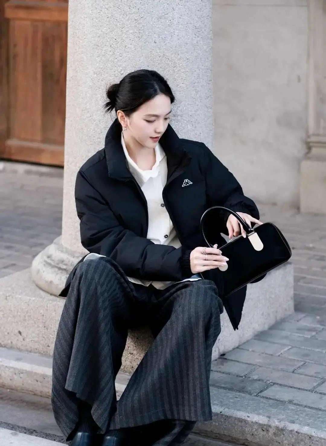 黑色羽绒服 冬季必备之选 露点领口袖口 更显高级风范 尝试叠穿 顿时让人眼前一亮 比如内搭蓝白条纹衬衫 袖口领口微微露出 搭配短裙 时尚感瞬间呈现 或者用连帽卫衣叠穿 卫衣帽子与羽绒服领子间 留些空隙 厚重感荡然无存 只露一点领子 也能让整体造型亮堂起来 剪裁合身的羽绒服 搭配皮质半身裙、羊毛打底裤 再添些细项链等小配饰 高级感这不就有了嘛