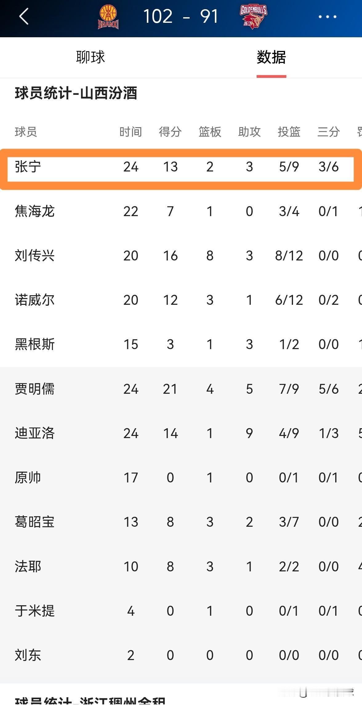山西汾酒球星张宁真是太稳定了!在今天山西汾酒主场以102:91战胜浙江稠州金租的比赛中,张宁一如既往的发挥稳定。 全场比赛下来,张宁首发出战24分钟,投篮9中5,其中三分球6中3得到13分2篮板3助攻1抢断,他的场上正负值为+6。 坦白说,只要张宁在场上,即便山西汾酒落后于对手,球队也能够实现逆转翻盘。