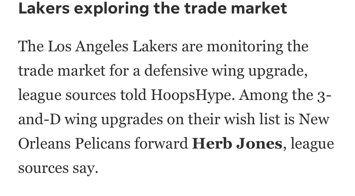 Scotto:步行者队对埃利斯表示出了兴趣。Scotto:洛杉矶湖人队正在密切关注交易市场,寻求补强防守型锋线球员。消息称,新奥尔良鹈鹕队前锋赫伯-琼斯正是湖人队心仪的3D锋线人选之一。