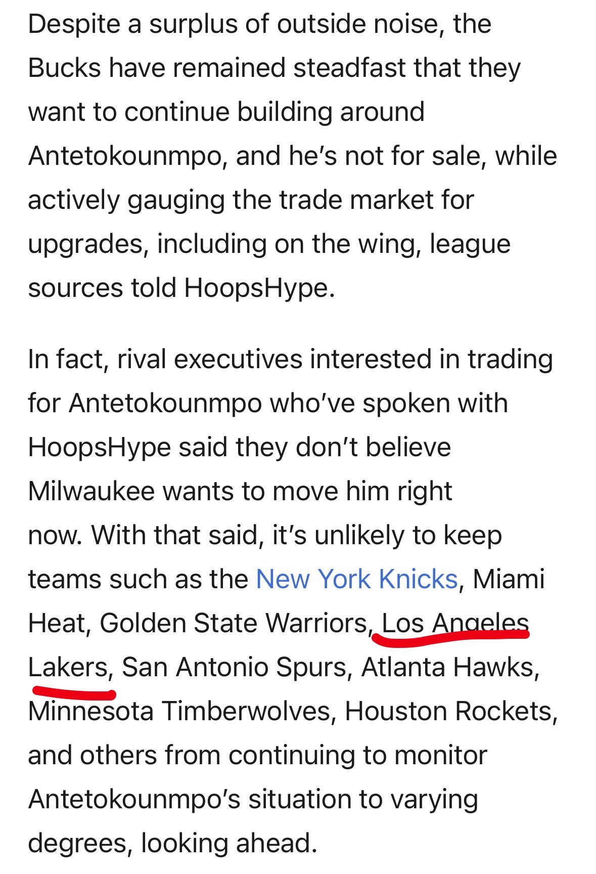 Scotto:那些有意通过交易得到字母哥的其他球队管理层人员在接受采访时也表示,他们认为雄鹿目前并无送走字母哥的打算。即便如此,纽约尼克斯、迈阿密热火、金州勇士、洛杉矶湖人、圣安东尼奥马刺、亚特兰大老鹰、明尼苏达森林狼、休斯顿火箭等一众球队,仍在不同程度上密切关注着字母哥的动向。