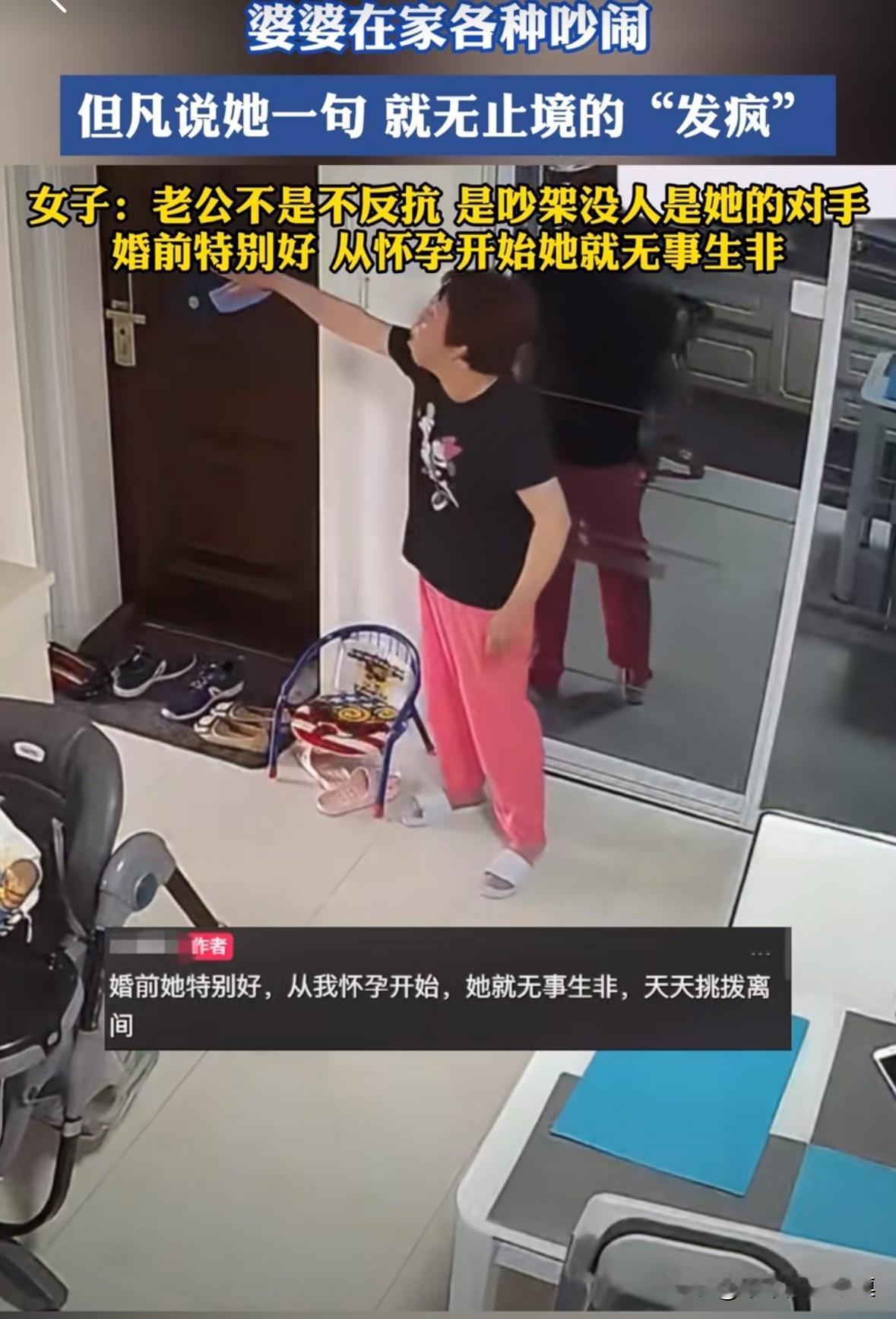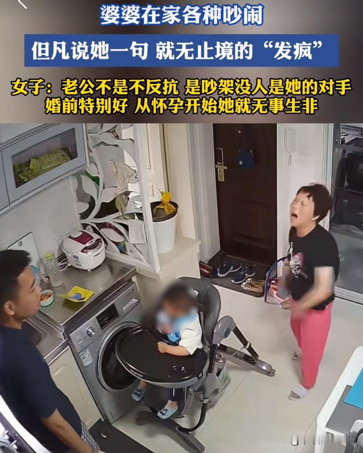 婆婆在家发疯似的吵闹,只要别人说她一句,她就会无休止的大吵大闹。 女子说:“我没怀孕前她特别好,自从我怀孕,她就开始无事生非,挑拨离间,弄的一家人都很无奈。” 女子的老公也试图跟婆婆沟通,她完全不听,而且争吵的更厉害。 女子说:“吵架没人是她的对手,我们都不敢说话。” 把你婆婆送回老家吧,整天这么闹,不仅孩子会受到影响,你们夫妻俩肯定也得离婚。 这样的恶婆婆见不得儿媳妇好,可能是你怀孕后,全家人都对儿媳妇关爱备至,心里不平衡了,所以就各种闹。 这种老人无德,根本不懂得家和万事兴,只关心自己,自私的很,远离为好。婆媳关系
