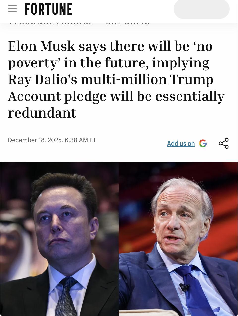 外媒:桥水基金创始人达利欧宣布将为特朗普账户捐赠,该账户是美国一项试点计划,为2025年至2028年出生的儿童提供1000美元政府资金的储蓄账户。 达利欧将为约30万儿童每人捐250美元,预计总额超7000万美元,主要面向康涅狄格州中等收入以下地区儿童。此前,戴尔夫妇已捐62.5亿美元。 但马斯克在X平台上回应称未来无人会贫困,无需储蓄,因人工智能和机器人将提供全民高收入,满足所有需求,货币概念也将消失。