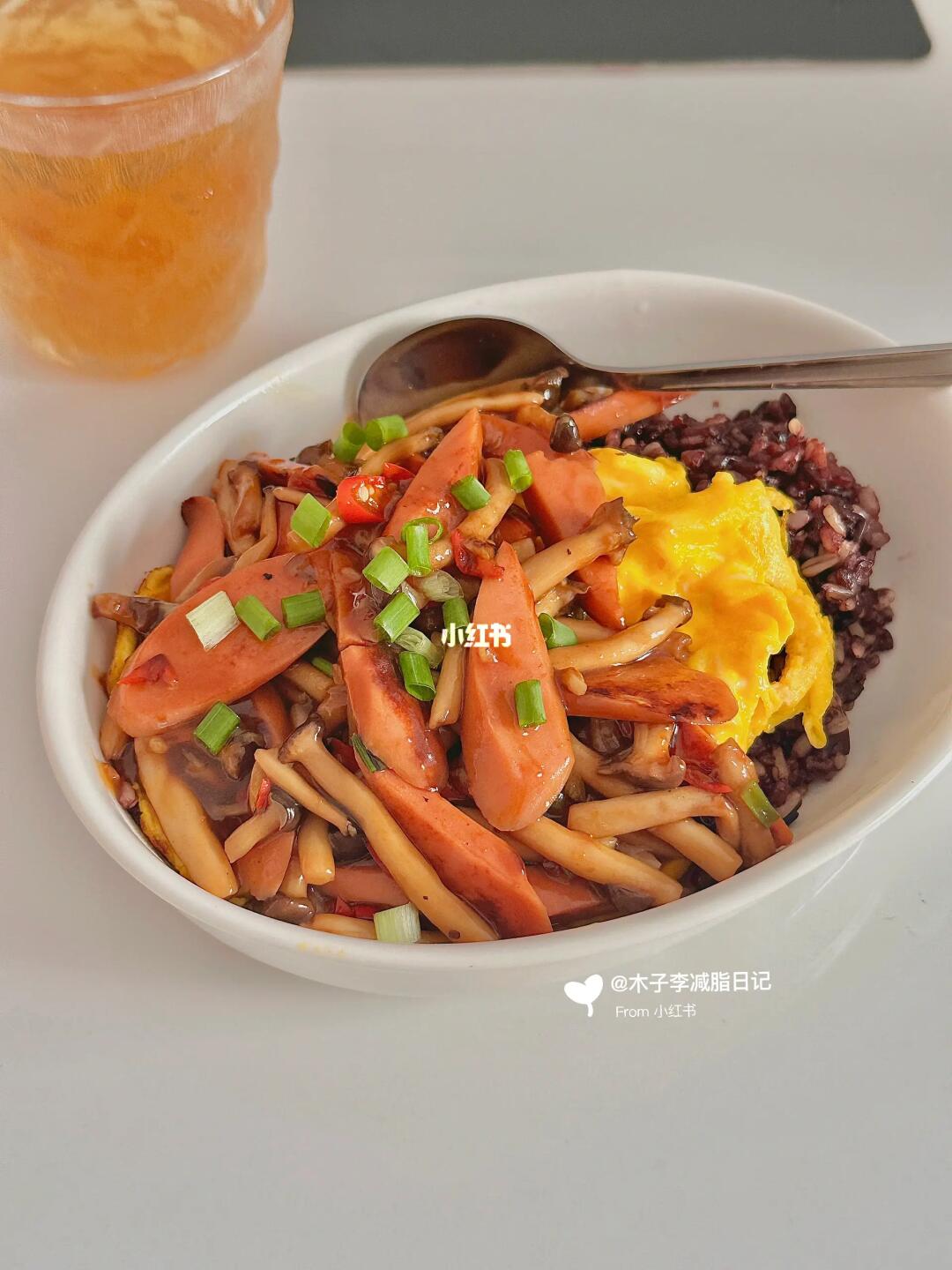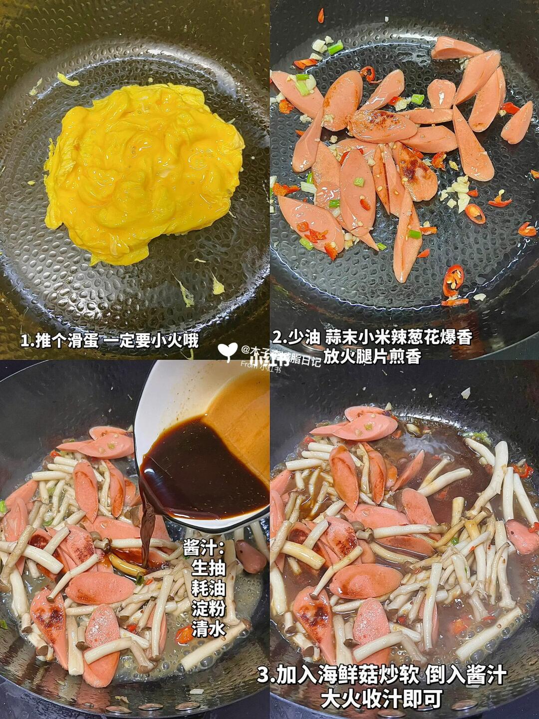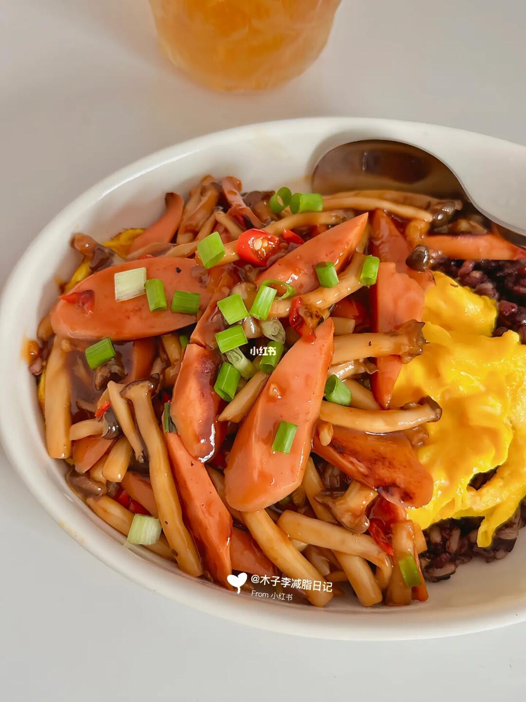 今天这个菌菇滑蛋盖饭太赞了👍🏻 好喜欢自己做的饭 简单的食材➕简单的烹饪 就能吃到很棒的减脂餐! - 🌈食材:杂粮饭🍚蟹味菇🍄鸡蛋 牛奶 香肠 - 1.鸡蛋➕牛奶搅匀,锅中少油,倒入鸡蛋液,往中间推至凝固 一定要小火 2.少油放蒜末 小米辣 葱 爆香,香肠煎香放蟹味菇炒软 放入酱汁 收汁即可! 3.酱汁:2勺生抽,1勺蚝油,1勺淀粉,半勺鸡精,适量清水搅匀! 好吃又美味~