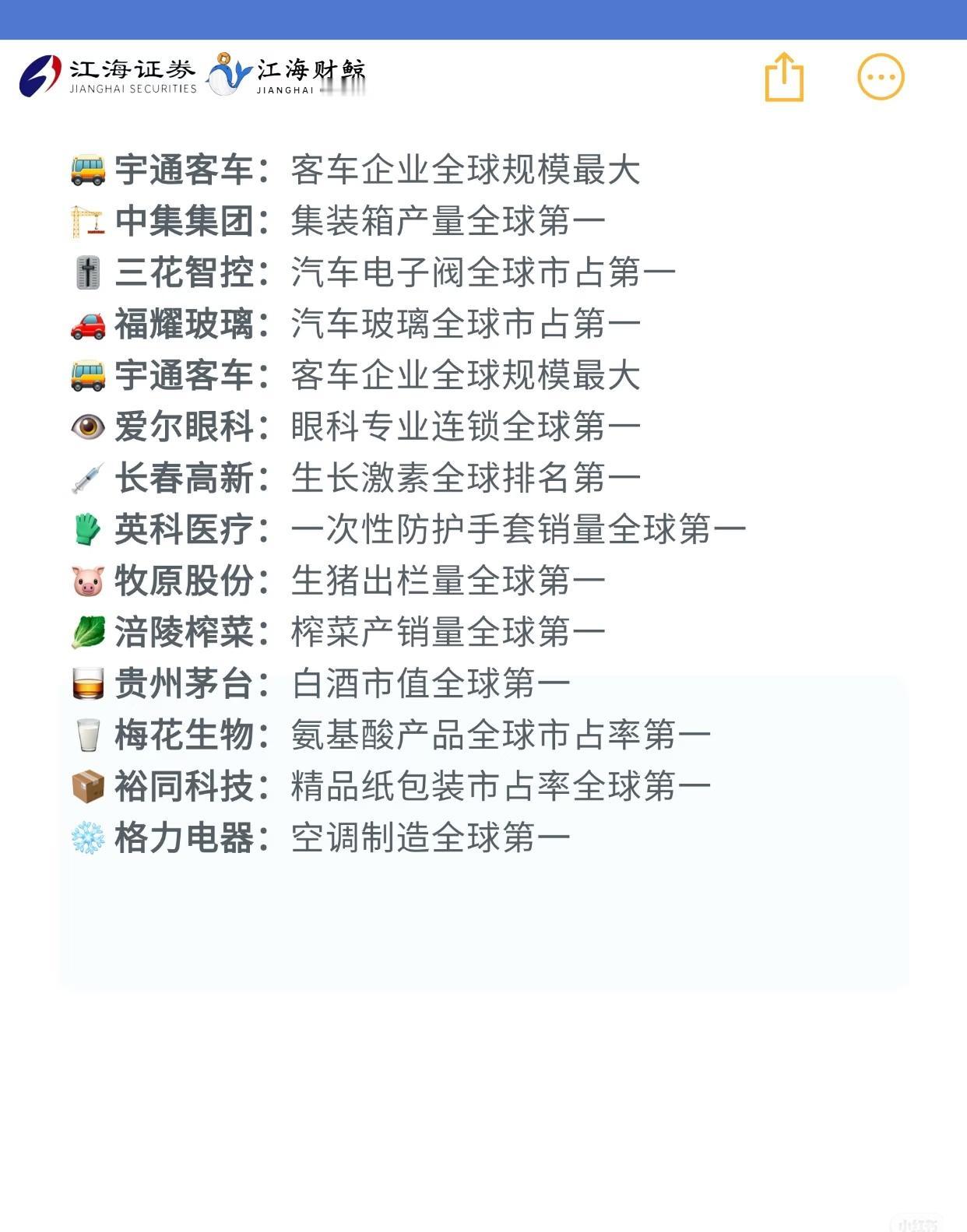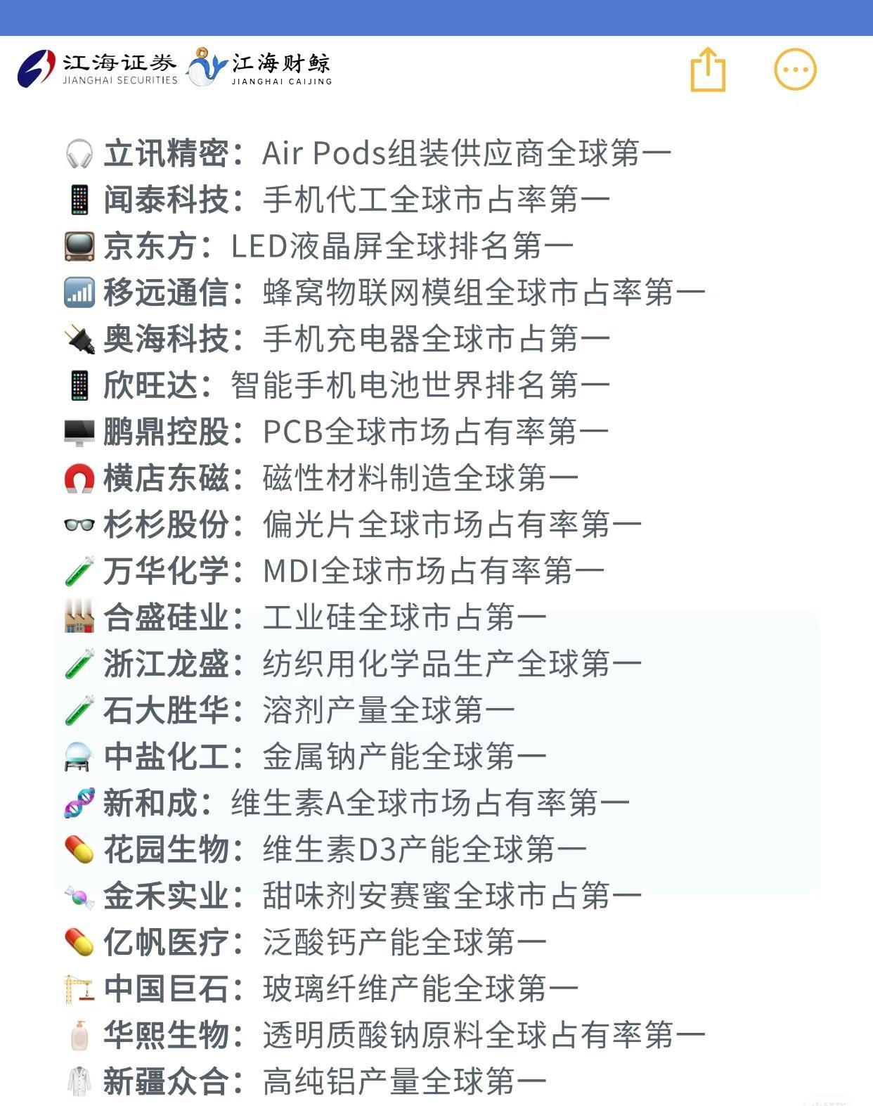 (收藏)全球市场占据领先地位的中国企业及其核心优势领域,覆盖新能源、电子信息、化工材料、高端制造、医疗健康、消费等多个行业,展现了中国企业在全球产业链中的关键地位。 第一组聚焦新能源及相关材料领域,凸显中国在绿色能源赛道的全球竞争力:宁德时代的动力电池装机量全球第一;隆基绿能的光伏组件全球市占率第一;阳光电源的光伏逆变器出货量全球第一;天赐材料的电解液产量全球第一;恩捷股份的隔膜产量全球第一;宏发股份的高压直流继电器全球市占率第一;通威股份的太阳能电池出货量全球第一;日月股份的风电铸件全球第一;福斯特的光伏胶膜全球市占率第一;中伟股份与格林美分别在三元前驱体的出货量、全球市占率上居首;诺德股份、鼎胜新材的锂电铜箔、铝箔产量全球第一;中国宝安的负极材料产量全球第一;中国中车的高铁制造能力全球第一。 第二组延伸至电子制造、化工及消费品原料领域,体现中国企业在细分领域的深度渗透:立讯精密是Air Pods组装供应商全球第一;闻泰科技的手机代工全球市占率第一;京东方的LED液晶屏全球排名第一;移远通信的蜂窝物联网模组全球市占率第一;奥海科技的手机充电器全球市占率第一;欣旺达的智能手机电池世界排名第一;鹏鼎控股的PCB全球市场占有率第一;横店东磁的磁性材料制造全球第一;杉杉股份的偏光片全球市场占有率第一;万华化学的MDI全球市场占有率第一;合盛硅业的工业硅全球市占率第一;浙江龙盛的纺织用化学品生产全球第一;石大胜华的溶剂产量全球第一;中盐化工的金属钠产能全球第一;新和成的维生素A全球市场占有率第一;花园生物的维生素D3产能全球第一;金禾实业的甜味剂安赛蜜全球市占率第一;亿帆医疗的泛酸钙产能全球第一;中国巨石的玻璃纤维产能全球第一;华熙生物的透明质酸钠原料全球占有率第一;新疆众合的高纯铝产量全球第一。 第三组覆盖高端制造、汽车部件、医疗健康及消费领域,展现中国企业在传统优势与创新领域的全面领跑:宇通客车是全球规模最大的客车企业;中集集团的集装箱产量全球第一;三花智控的汽车电子阀全球市占率第一;福耀玻璃的汽车玻璃全球市占率第一;爱尔眼科是眼科专业连锁全球第一;长春高新的生长激素全球排名第一;英科医疗的一次性防护手套销量全球第一;牧原股份的生猪出栏量全球第一;涪陵榨菜的榨菜产销量全球第一;贵州茅台的白酒市值全球第一;梅花生物的氨基酸产品全球市占率第一;裕同科技的精品纸包装市占率全球第一;格力电器的空调制造全球第一。 整体来看,这些企业分布在从基础材料到终端产品、从传统制造到新兴科技的广泛领域,均以“全球第一”或“全球市占/产能/出货量领先”的市场地位,印证了中国制造业在全球产业链中的核心竞争力和规模优势。