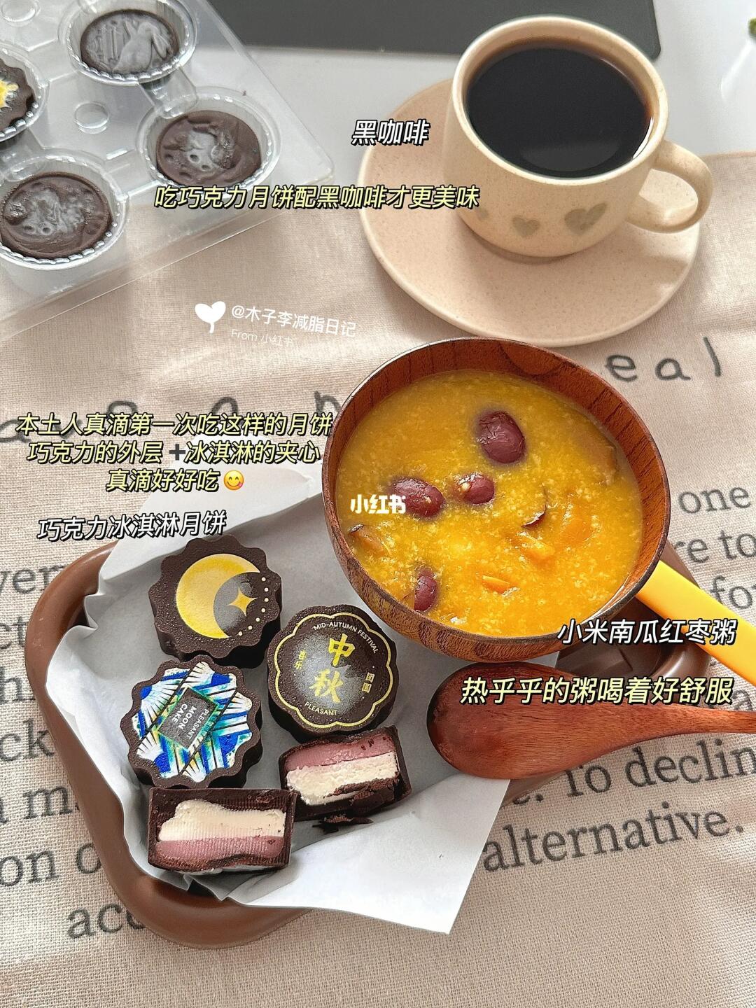 ●原体重:120斤 | 现重:90.6斤 - 🥣早午餐:巧克力冰淇淋月饼 南瓜小米粥 黑咖啡 🥣晚:烤肉 气泡水 💧喝水1800ml 🏋️运动:散步 - 💭吃了秋天的第一枚巧克力冰淇淋月饼,下午又去吃了烤肉!今天又是取悦自己的一天🥳 💭普莱赞巧克力冰淇淋月饼 内陷冰冰凉凉加上厚厚的巧克力外皮一口下去不要太幸福!不仅好吃😋还是中国热带农业科学院研发的,里面有9种口味每一颗都好精致,第一次吃巧克力冰淇淋月饼的我 真滴相当惊艳啦!中秋佳节来临无论送人还是自己吃都不错!