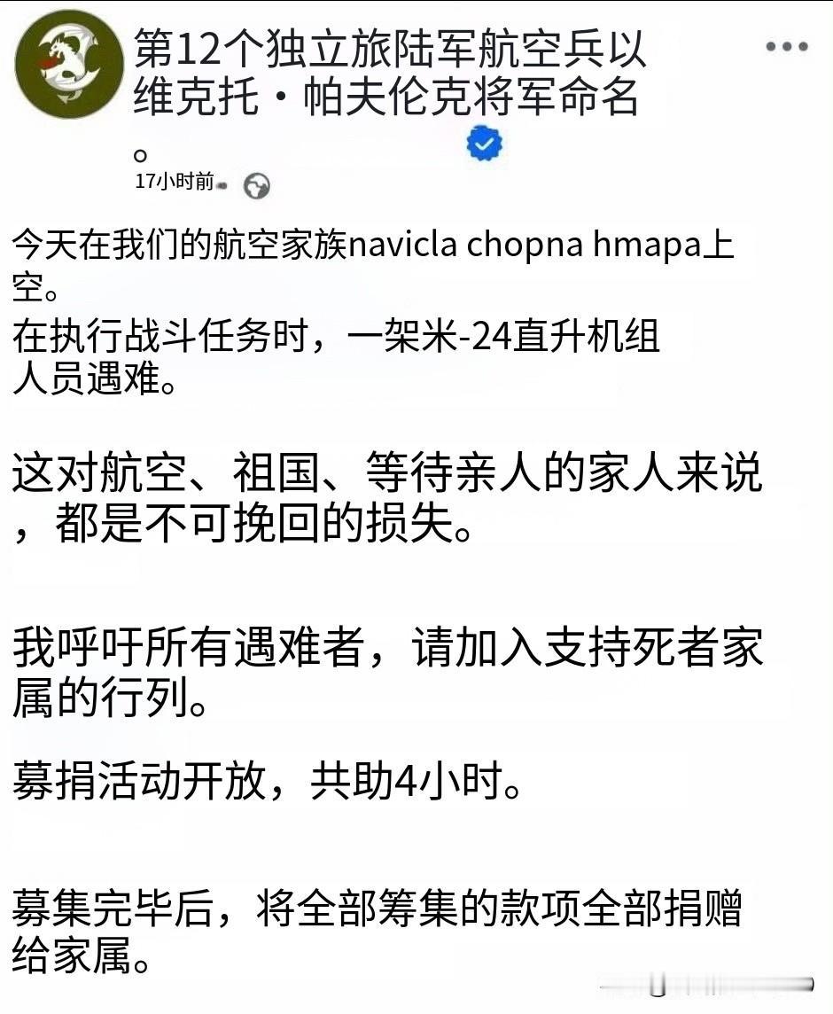 又掉了,乌军第12独立陆航旅宣布今天在作战行动中损失一架米-24直升机, 4名机组成员全部阵亡。 该旅呼吁为阵亡人员家属进行募捐活动。 根据描述,大概率是被俄军击落的。