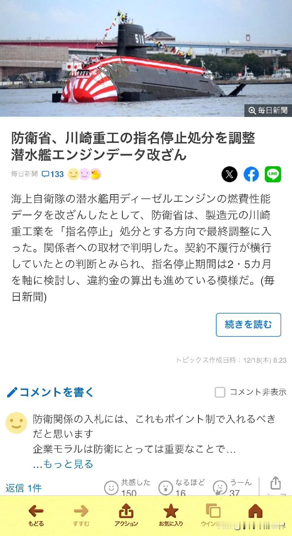 川崎重工潜艇引擎数据造假,日本防卫省给出的惩罚是暂停川崎重工两个半月的竞标资格。 这惩罚,你说他没惩罚吧,他暂停两个半月的竞标资格,你说他有惩罚吧,这个惩罚跟没惩罚有啥区别? 这两个半月,日本也没有竞标潜艇这个事,更不用说,日本潜艇生产就他自己一家,惩罚个啥? 也怪不得日媒天天抹黑PLA装备造假,原来是他自己造假造出花了,所以他认为PLA也会这么干,或者说必须这么干,否则光他自己和老美这么干,那也太丢人了。 日本企业造假,已不光是企业自家的事,日本政府层面也是门清,你要说造假一两次,多少还能说得过去,像日本这些大企业造假有的都持续几十年了,依然不改,你说日本政府层面不清楚谁会信? 就说这个川崎重工,不光是日本最新一代大鲸号潜艇引擎动力问题,燃油数据夸大,就连它的上一代苍龙号也有问题,两代潜艇都有问题,你说他这个造假,那得有多长的历史? 当然了,他造不造假,跟咱们没关系,反正他坑的是自家日本。