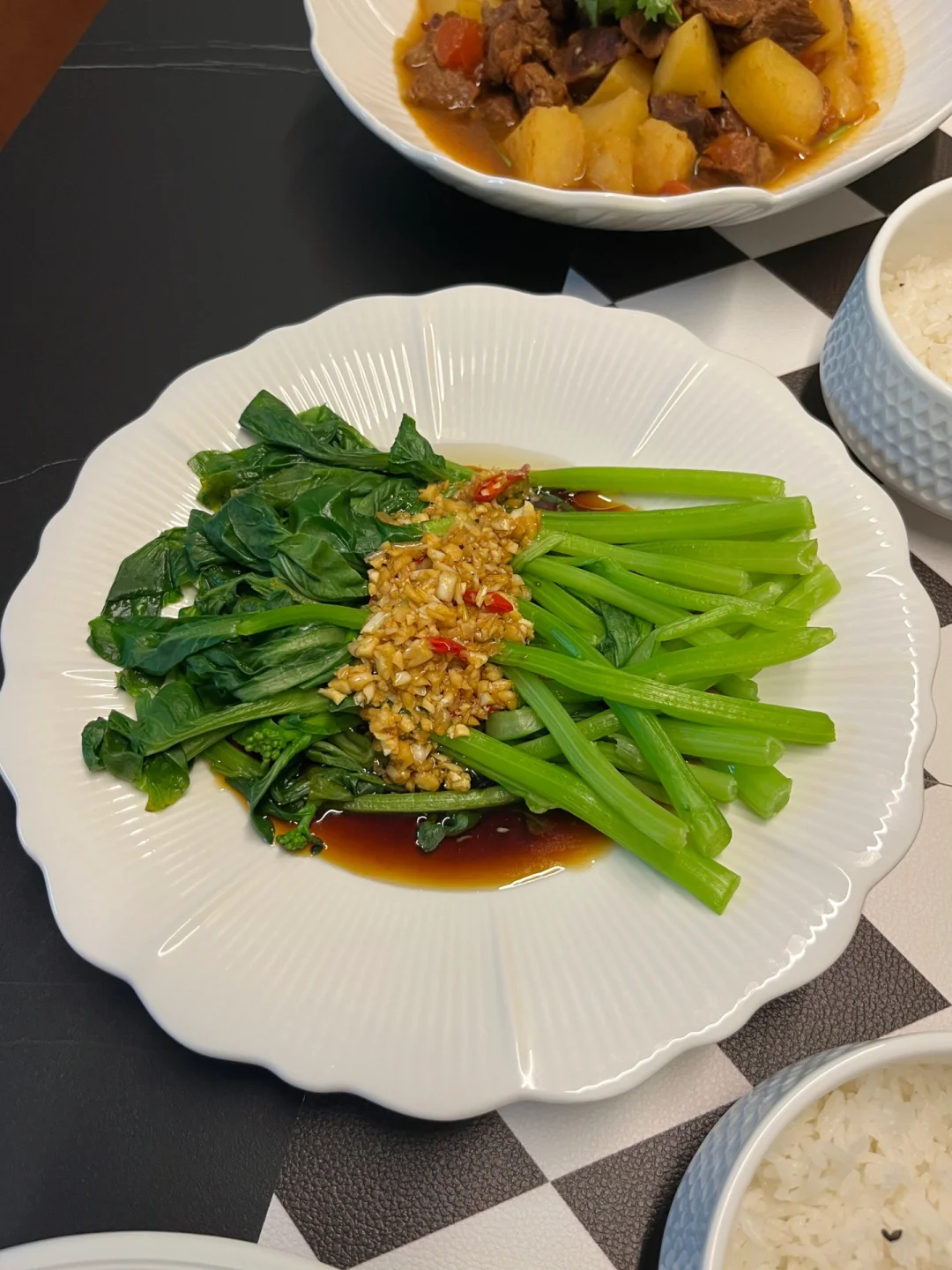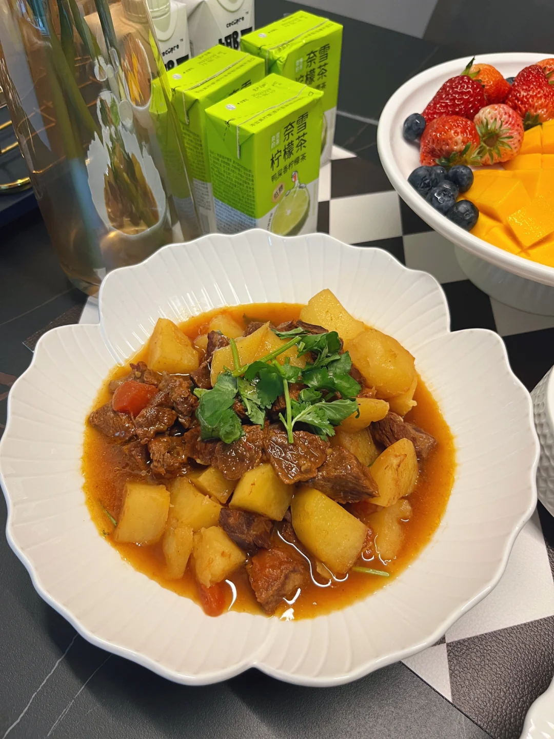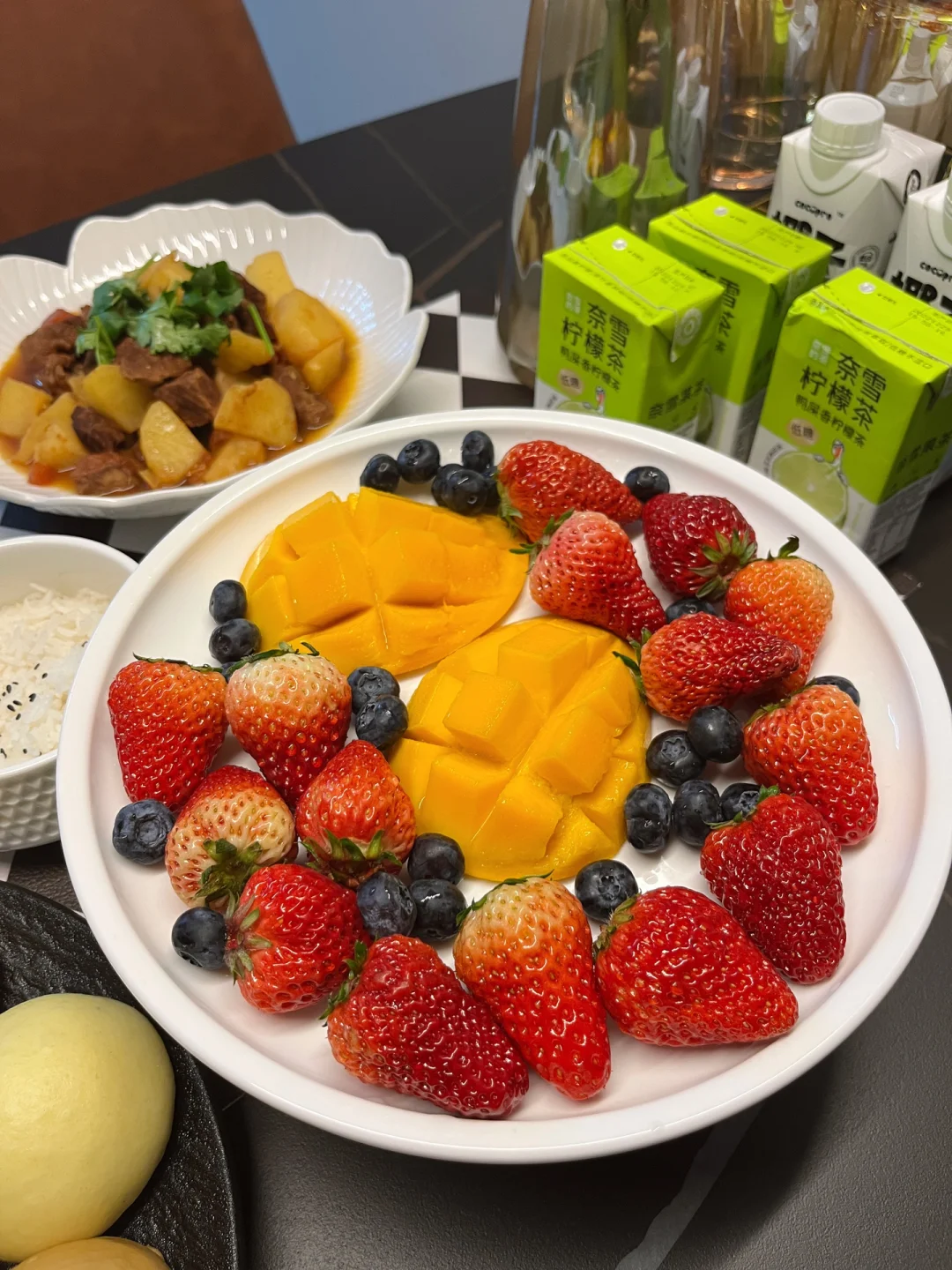 我相信对很多人来说,厨房都是承载幸福的地方,锅碗瓢盆的碰撞,柴米油盐的交融,系上我的小围裙为家人做一桌可口的家常菜,其乐融融的一顿晚餐,再治愈不过了…… 【今日菜单分享】 1️⃣蓝莓山药泥 2️⃣红烧土豆炖牛肉 3️⃣白灼菜心 4️⃣麻辣红油拌藕片 5️⃣外婆菜窝窝头 6️⃣主食:米饭,窝窝头 7️⃣水果:草莓,蓝莓,芒果 8️⃣饮料:柠檬茶,椰汁 【蓝莓山药】:我们全家人都喜欢吃的一道小甜品,酸酸甜甜很开胃,甜度也可以根据口味自己调节,喜欢甜一些的可以在山药泥里加炼乳,蓝莓酱里加蜂蜜~ 【外婆菜窝窝头】:塞满外婆菜的窝窝头,一口咬下去太满足了,窝窝头买的现成的,直接蒸熟就可以,当然单吃外婆菜配米饭也是巨下饭~ 【红烧土豆炖牛肉】:电饭煲做的软烂入味,两个小时做一大桌菜当然除了做饭熟练以外,好用的厨房小家电也是帮了我的大忙,这个双胆电饭煲,它能同时烹饪两道菜或者3道菜也没问题~蒸米饭的同时再炖个牛肉,不占用我的燃气灶炒其他菜,多个锅子同时做菜既节省时间又能同时出锅不担心隔得时间太久饭菜放凉的问题~