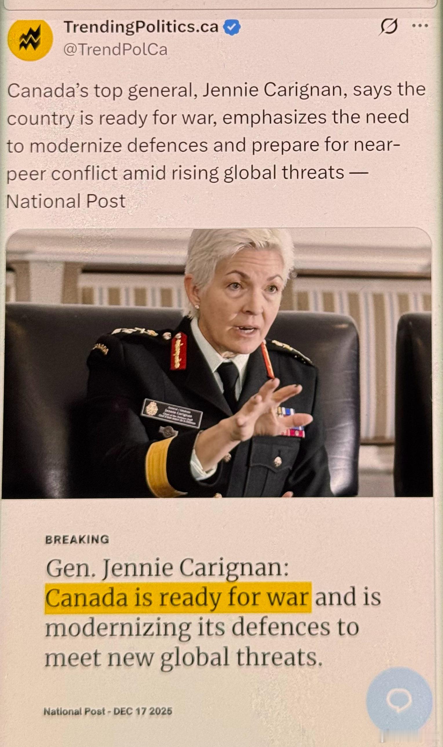 突发!加拿大高级将领詹妮·卡里格南表示,加拿大已经为战争做好了准备,并强调有必要实现国防现代化,并在全球威胁不断上升的情况下,为近距离冲突做好准备。
